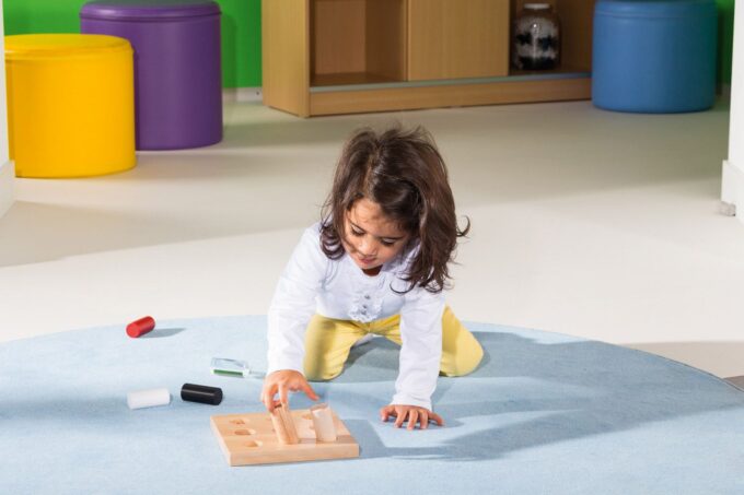- Spielen mit Druck und Gewicht: Beim Stecken und Herausziehen der Objekte erfahren Kinder, wie viel Kraft sie für die einzelnen Materialien aufwenden müssen. Diese Herangehensweise verbessert das Verständnis von Kraftdosierung nachhaltig.