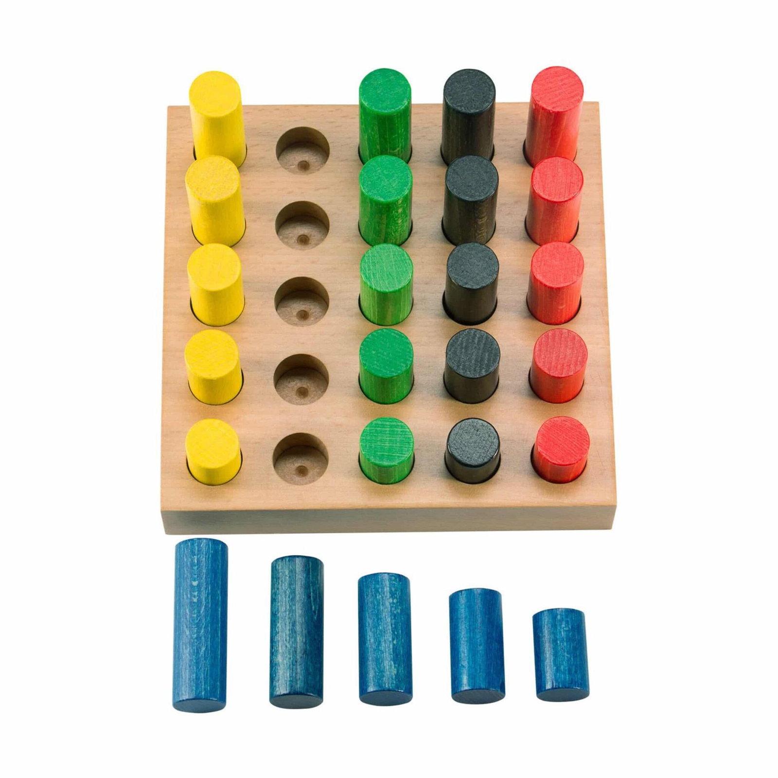 - Farben erkennen und zuordnen: Die fünf Farben der Walzenstecker laden dazu ein, Farbgruppierungen vorzunehmen und ein Verständnis für Farbsysteme zu entwickeln.