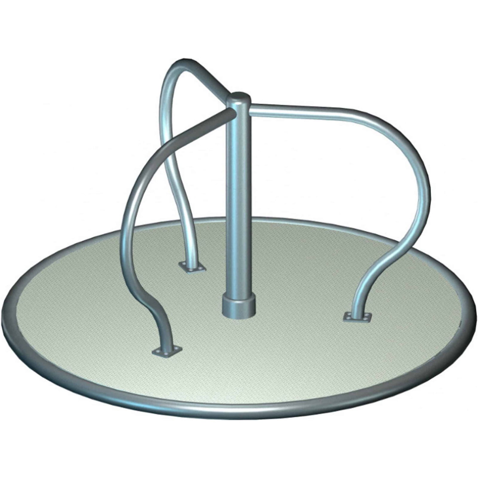 Karussell-Stehmodell mit zentraler Säule aus pulverbeschichtetem Stahl und Bodenplatte aus 2 mm starkem Aluminium-Diamantblech. Lieferung einschließlich Bodenanker für das Einbetonieren und Ausgestattet mit qualitativ hochwertigen Kugellagern für eine lange Nutzungsdauer
