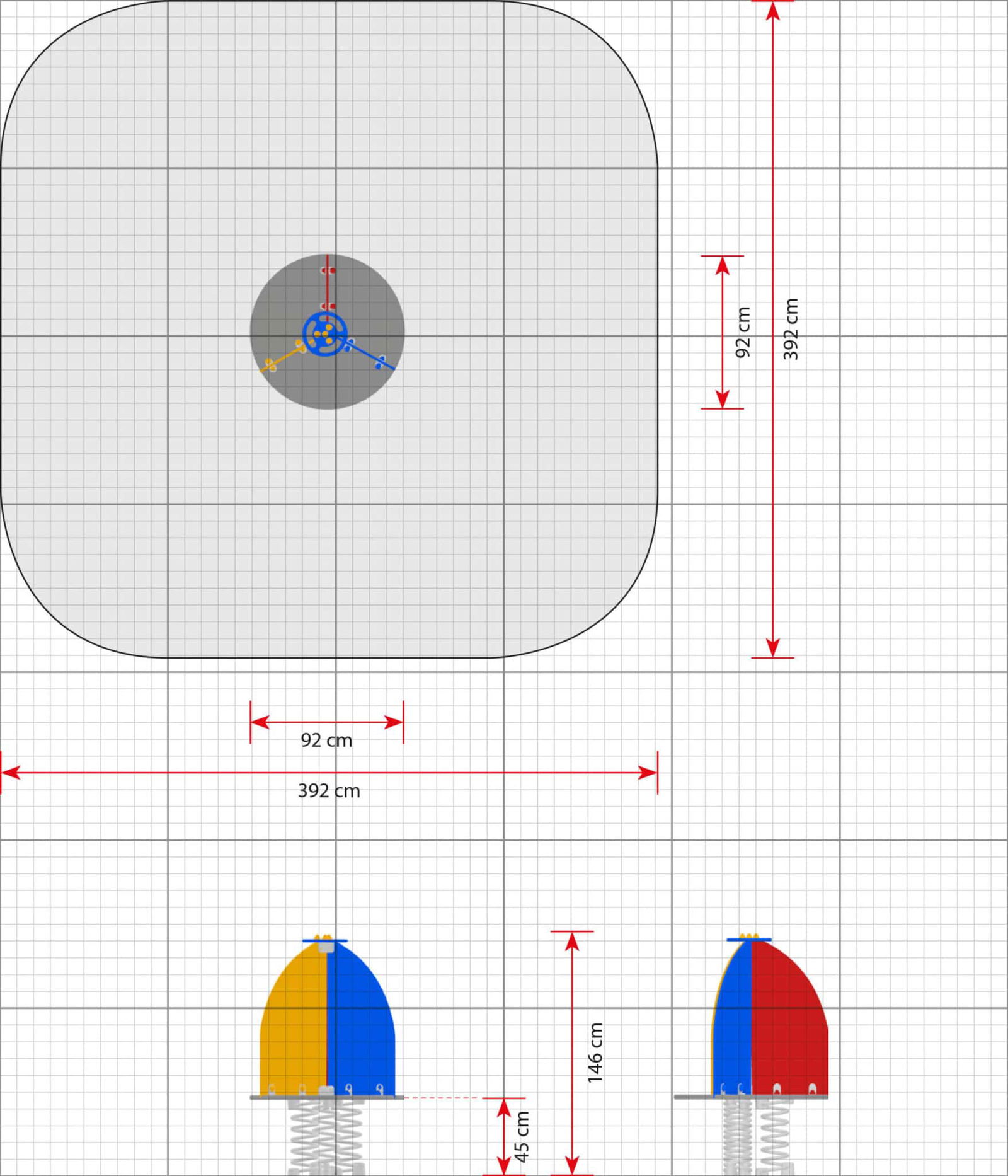 • Platzbedarf inkl. Sicherheitsabstände (LxB): 392 x 392 cm