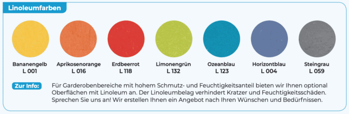 - Linoleumbelag-Option: Pflegeleichte, hygienische Oberfläche für intensive Nutzung und einfache Reinigung.