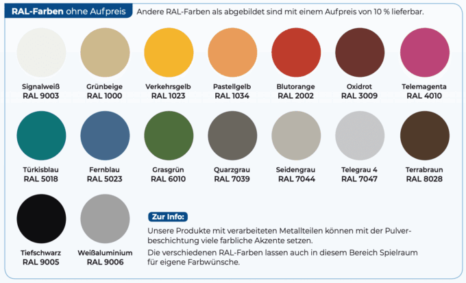 - Stahlfarbe: Alle RAL-Farben verfügbar