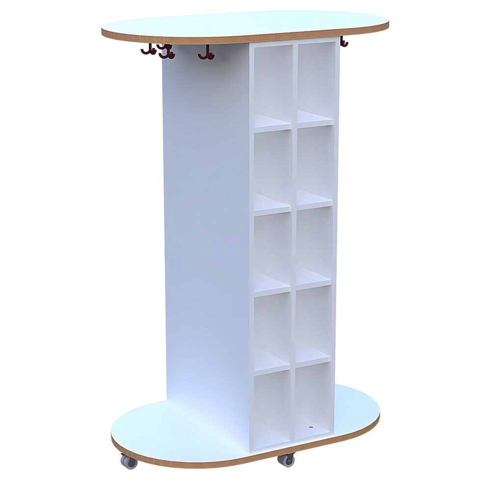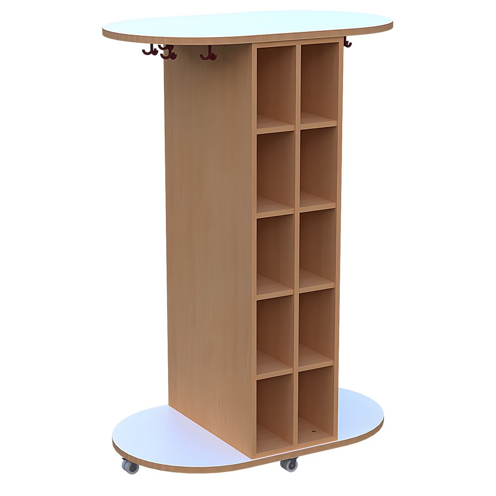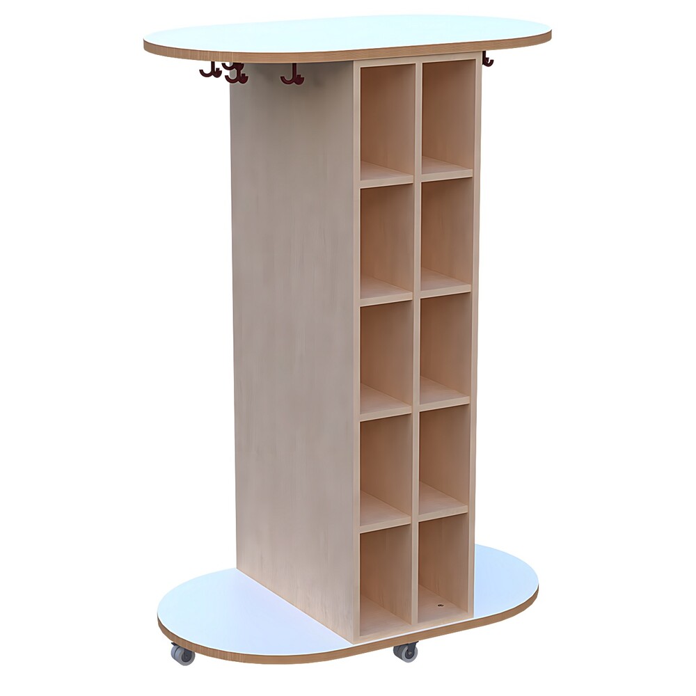 Das absolute Highlight dieses Modells ist seine intelligente, beidseitige Nutzbarkeit. Das clevere Design ermöglicht es, dass mehrere Kinder gleichzeitig von beiden Seiten an ihre Sachen gelangen, was das oft hektische An- und Ausziehen vor und nach den Pausen deutlich entzerrt. Jede Seite des Wagens ist als Regal konzipiert und mit jeweils zwei mal fünf geräumigen Fächern ausgestattet. Diese insgesamt zwanzig Fächer bieten den idealen, trockenen Ort für Gummistiefel, Hausschuhe oder Wechselschuhe. Durch die offene Struktur kann die Luft optimal zirkulieren, sodass feuchtes Schuhwerk schneller trocknet und unangenehme Gerüche effizient vermieden werden.