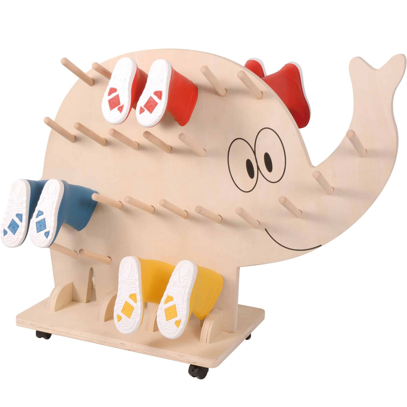 Stiefel hübsch und platzsparend aufräumen … 25 Paar Stiefel können am Stiefel-Elefanten zum Trocknen aufgehängt werden. Der mobile Ständer ist beidseitig bestückbar und kann nach Wunsch bemalt oder lackiert werden. Inkl. wasserfestem Holzleim zum Einkleben der Stäbe.