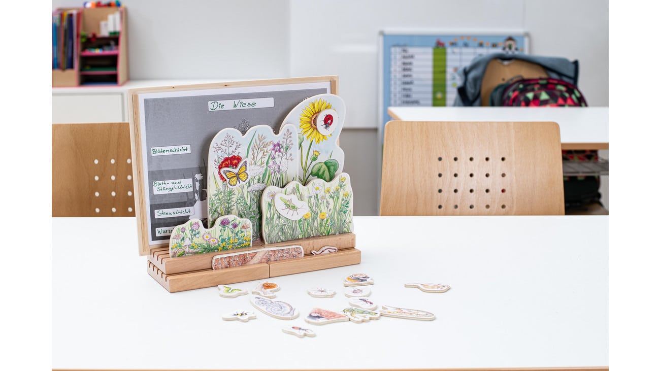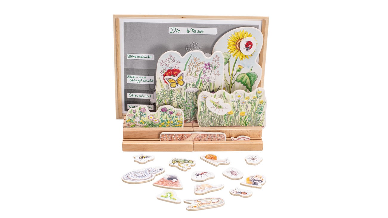Mit 26 einzelnen Teilen und liebevoll gestalteten Naturdarstellungen bietet das Set eine umfassende Möglichkeit, die unterschiedlichen Schichten der Wiese zu erkunden. Von der Wurzelschicht über die Streuschicht bis zu den Blüten ist alles dabei. Kinder können selbstständig die Schichten aufbauen und die tierischen Mitbewohner, wie den Maulwurf, Schmetterling oder die Ameise, an ihrem richtigen Platz positionieren.