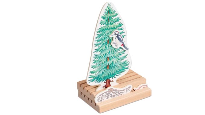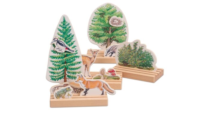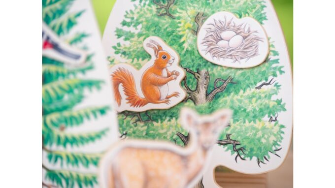 Ein besonderes Highlight ist die Möglichkeit, eine Diskussion zu führen: Wo würde sich zum Beispiel ein Reh in diesem Szenario verstecken? Einige Elemente des Spiels sind magnetisch, sodass das Vogelnest oder die Spinne an Bäumen und Sträuchern befestigt werden kann, um ein realistisches Bild zu schaffen.