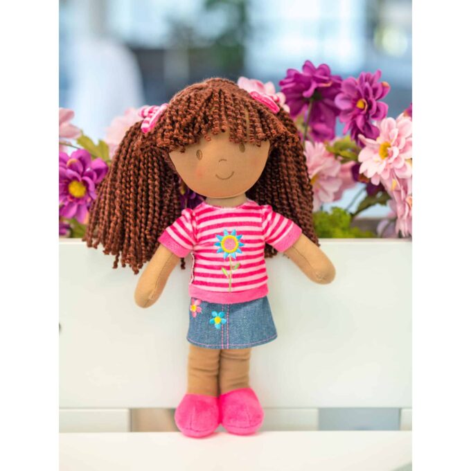 Paulina freut sich darauf, die Welt zu erkunden und neue Freunde zu finden! Sie ist liebevoll gekleidet in einem fest vernähten Rock und Shirt, sodass Ihre Kinder sich keine Sorgen um verlorene Kleidung machen müssen. Der Körper der Puppe ist fest wattiert, aber dennoch weich und flexibel, was sie perfekt zum Kuscheln geeignet macht. Mit ihrem verschmitzten Lächeln hat Paulina die Fähigkeit, jedes Kind sofort in ihren Bann zu ziehen und ein Lächeln auf die Gesichter zu zaubern.