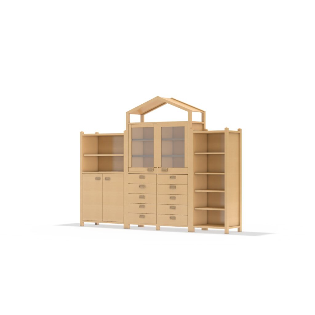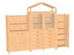 - Weiterer Hochschrank: Unten mit zehn (2 x 5) Schubkästen; oben Doppeltür mit Glasfüllung und Mittelwand mit zwei Einlegeböden und Dachaufsatz