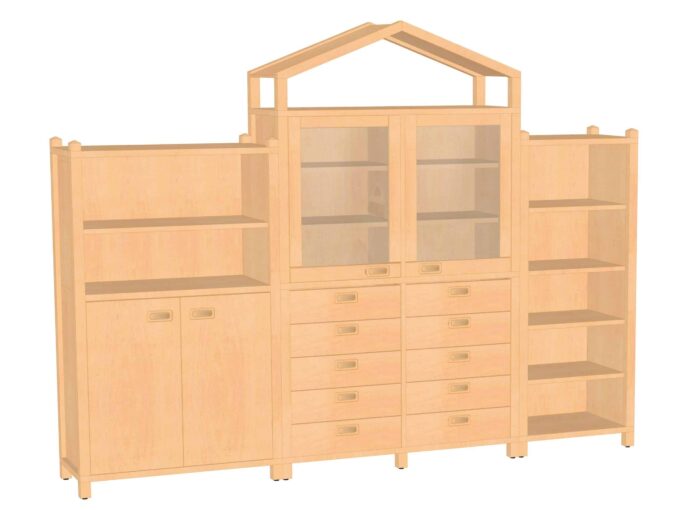 - Weiterer Hochschrank: Unten mit zehn (2 x 5) Schubkästen; oben Doppeltür mit Glasfüllung und Mittelwand mit zwei Einlegeböden und Dachaufsatz