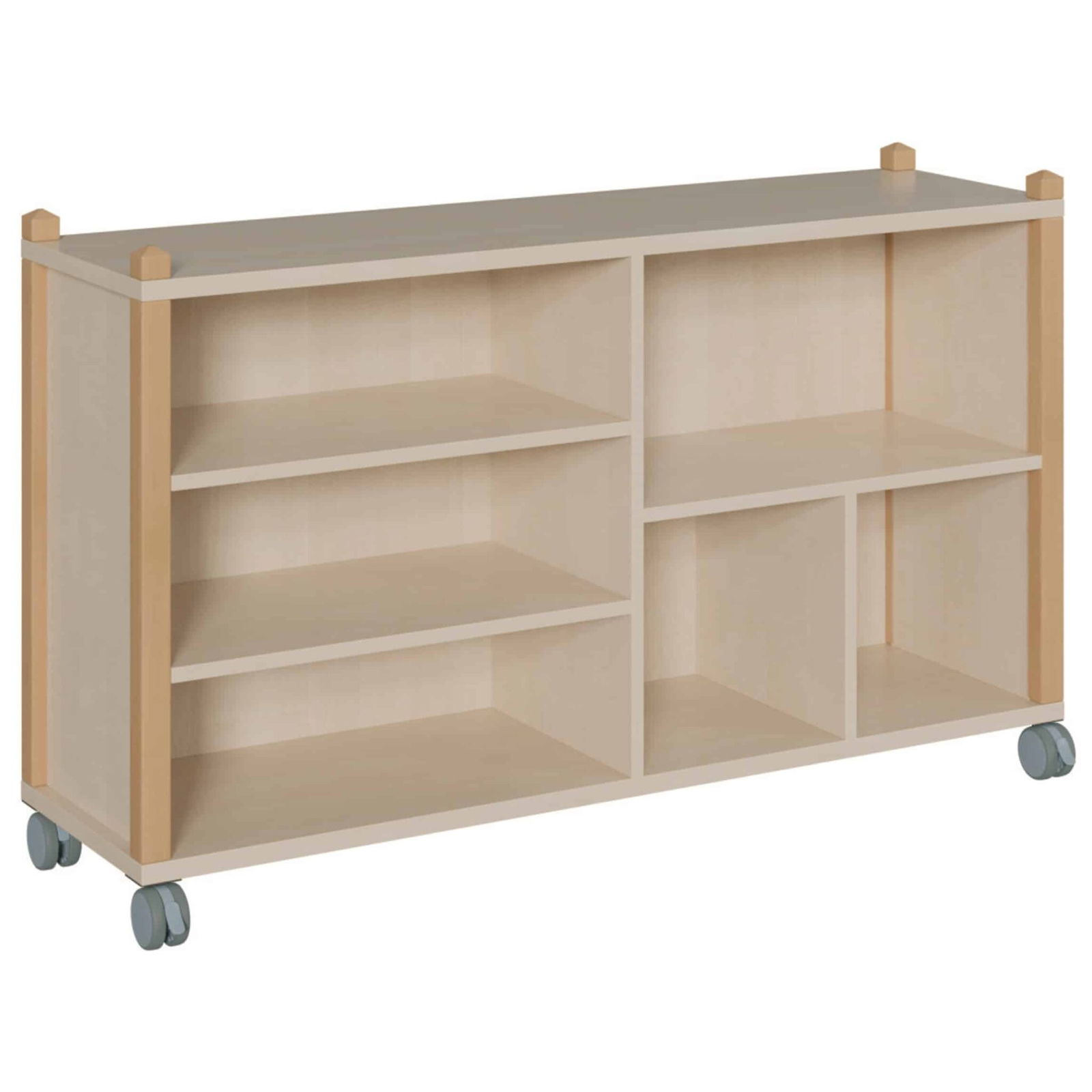 Fahrbares Kita Stollenregal mit Seitenstollen, Füßen und Abschlussstollen aus Buche Massivholz. Korpusteile aus 35 und 19 mm E1-Spanplatte.