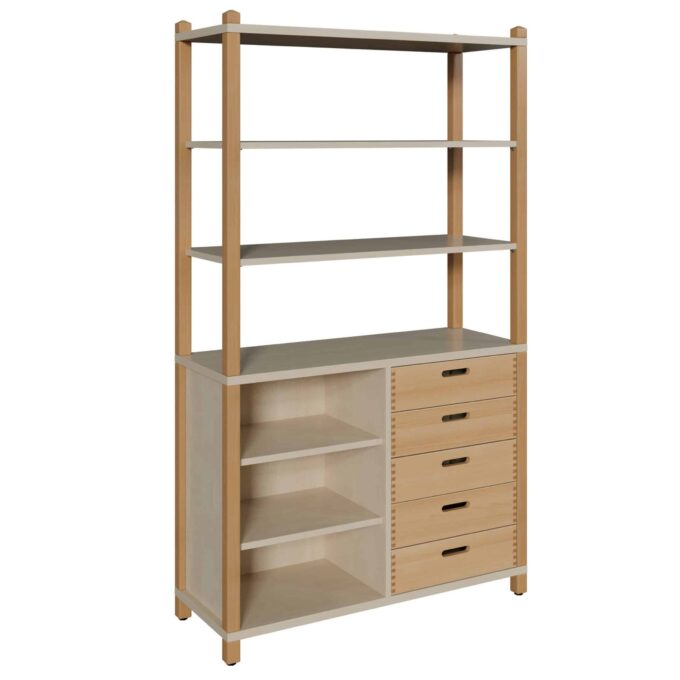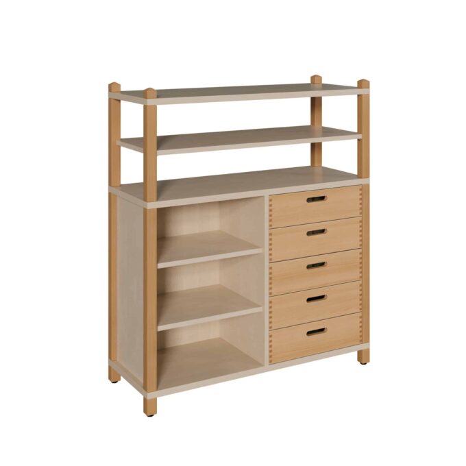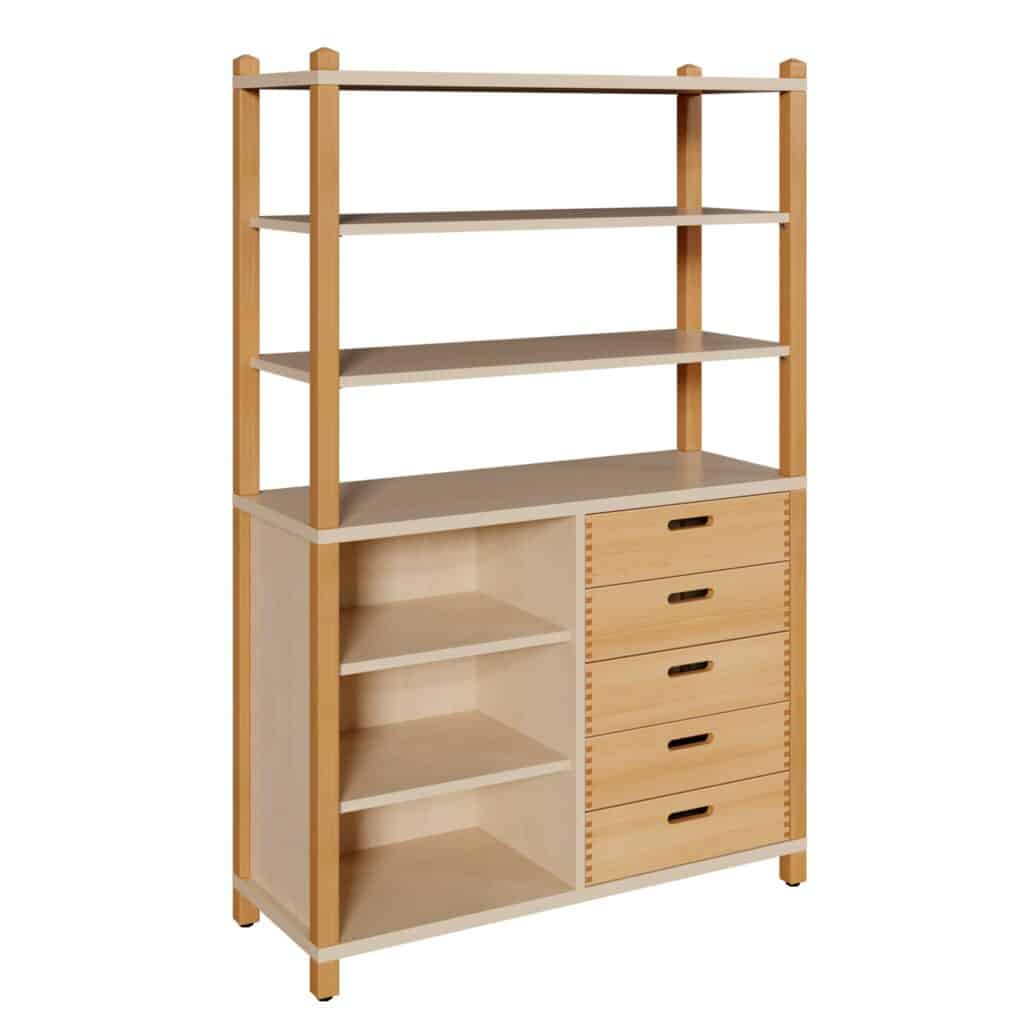 Stollenregal mit 5 Massivholzschüben und Regalaufsatz Breite 106 cm für Krippen & Kindergarten