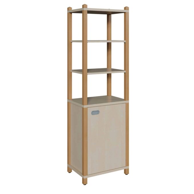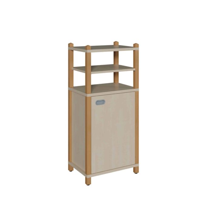Dieser eintürige Stollenschrank mit offenem Regalaufsatz ist die ideale Lösung, um auch auf begrenztem Raum maximale Ordnung und Struktur zu schaffen. Mit seinem cleveren Design nutzt er die Raumhöhe perfekt aus und kombiniert geschützten Stauraum mit einem leicht zugänglichen, offenen Bereich. Das schlanke Profil macht ihn zum perfekten Möbelstück für Nischen, Ecken oder schmalere Wandabschnitte. Hier können Sie alles unterbringen, was im lebhaften Kita-Alltag einen festen Platz braucht – von Bastelmaterialien bis zu wichtigen Unterlagen. Die robuste Konstruktion mit massiven Buchenholz-Elementen garantiert Langlebigkeit und bringt eine warme, natürliche Atmosphäre in Ihre Räume.