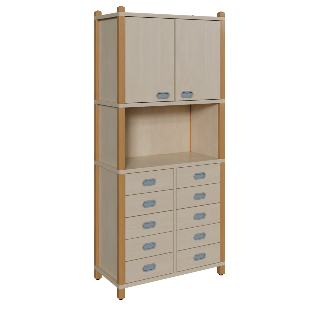 Stollenschrank mit 10 Schüben & Oberschrank. Viel Stauraum, stabil & flexibel. Perfekt für Kita, Schule & Büro. Jetzt entdecken!