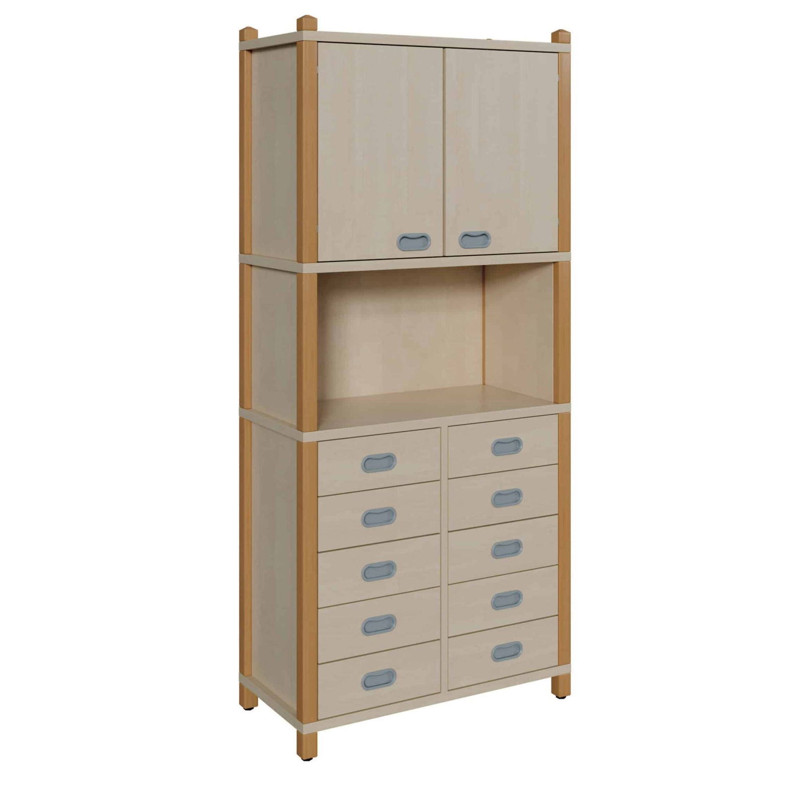 Stellen Sie sich ein Möbelstück vor, das maximale Organisation und geschützten Stauraum in einem eleganten, hochstabilen Design vereint. Dieser hochformatige Stollenschrank ist die ultimative Lösung für alle, die sowohl Kleinteile als auch größere Gegenstände sicher und übersichtlich aufbewahren möchten. Er kombiniert eine 80 cm hohe Kommode mit zehn praktischen Dekorschubladen mit einem geräumigen, zweitürigen Oberschrank. Dieses durchdachte System bietet eine perfekte Balance: detailgenaue Sortierung in den unteren Schüben und großzügiger, blickdichter Stauraum dahinter. Gebaut für höchste Beanspruchung, ist dieser Schrank die ideale Wahl für Kitas, Schulen, Büros und Werkstätten.