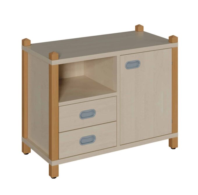 Entdecken Sie ein vielseitiges Möbelstück, das speziell für die Bedürfnisse von Kindern entwickelt wurde. Dieser 60 cm hohe Stollenschrank ist das perfekte Sideboard für Kitas, Kindergärten und Spielzimmer. Er kombiniert auf intelligente Weise zwei leicht zugängliche Dekorschubladen mit einem geräumigen Fach hinter einer Tür. Diese Aufteilung bietet eine ideale Mischung aus offen zugänglichem Stauraum und geschützter Aufbewahrung. Dank der niedrigen Bauhöhe und der extrem robusten Stollenkonstruktion ist er ein sicheres und langlebiges Möbelstück, das Kinder zur Selbstständigkeit ermutigt und gleichzeitig für eine aufgeräumte, einladende Atmosphäre sorgt.