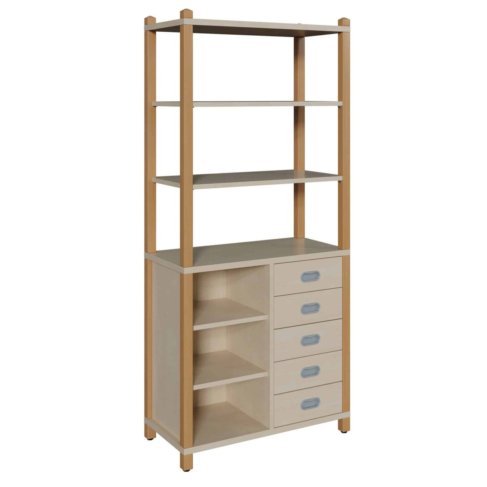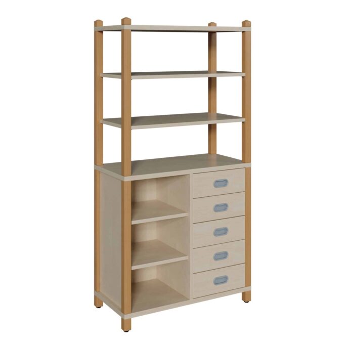 Stollenschrank mit 5 Dekorschüben, Regal und Regalaufsatz für Krippen & Kindergarten