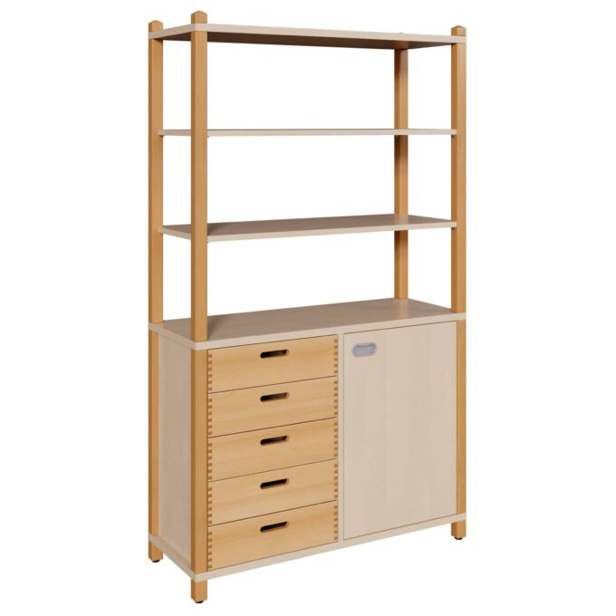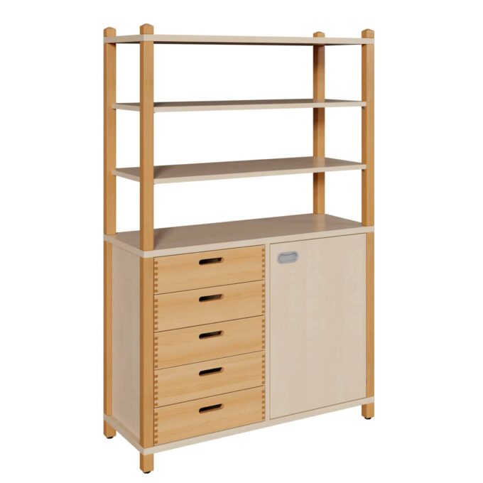 Stollenschrank mit 5 Massivholzschüben, 1 Tür und Regalaufsatz für Krippen & Kindergarten