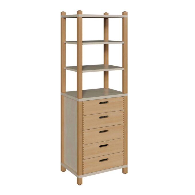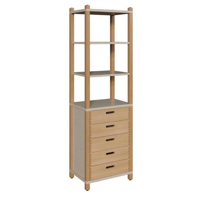 Stollenschrank mit 5 Massivholzschüben und Regalaufsatz Breite 56 cm für Krippen & Kindergarten