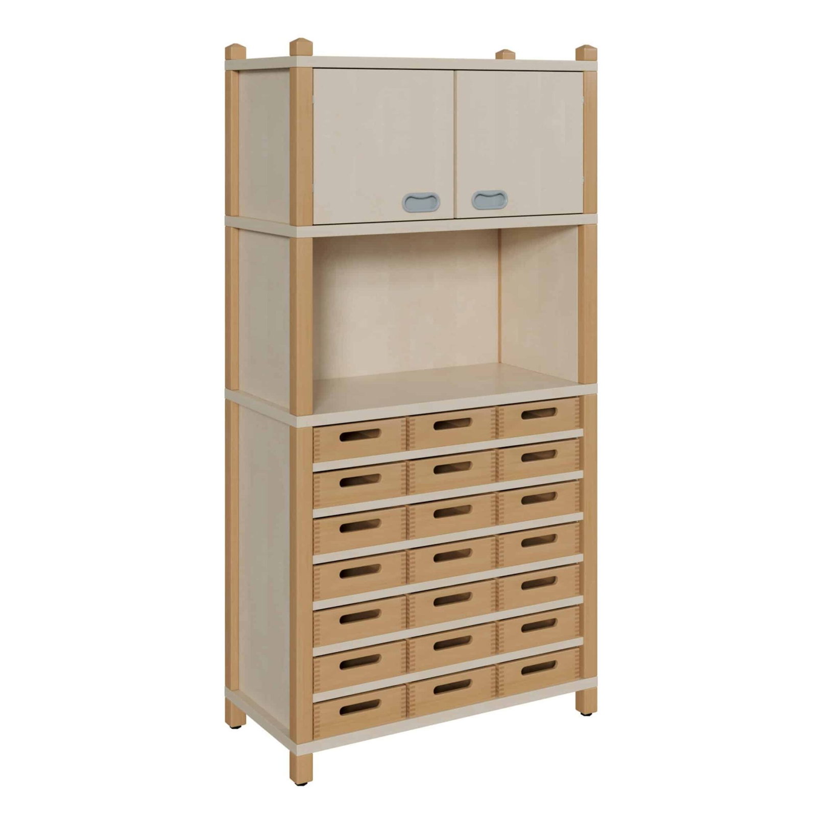 Stellen Sie sich einen Gruppenraum vor, in dem jedes kleine Teil seinen festen Platz hat und das Aufräumen zum Kinderspiel wird. Dieser Stollenschrank ist die ultimative Lösung für Kitas und Schulen, die eine hochgradig systematische und gleichzeitig flexible Aufbewahrung benötigen. Mit beeindruckenden 21 flachen Massivholzkästen bietet er eine unübertroffene Kapazität für die feingliedrige Sortierung von Stiften, Bastelmaterialien und kleinen Spielsachen. Ergänzt wird dieses Ordnungssystem durch einen geräumigen, zweitürigen Oberschrank, der zusätzlichen, geschützten Stauraum bereitstellt. Dank seiner extrem robusten Bauweise, anpassbaren Optionen und durchdachten Sicherheitsmerkmalen ist dieser Schrank die perfekte Investition in eine dauerhaft strukturierte und anregende Umgebung.