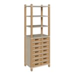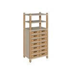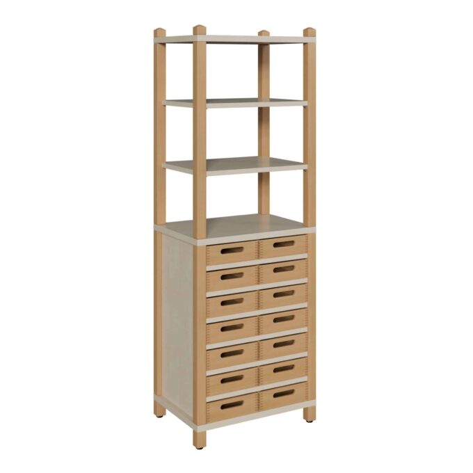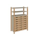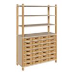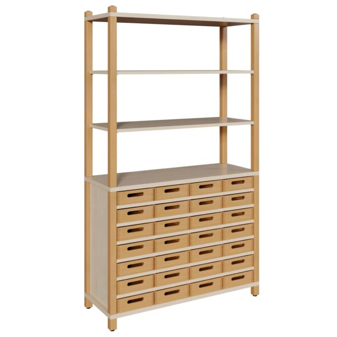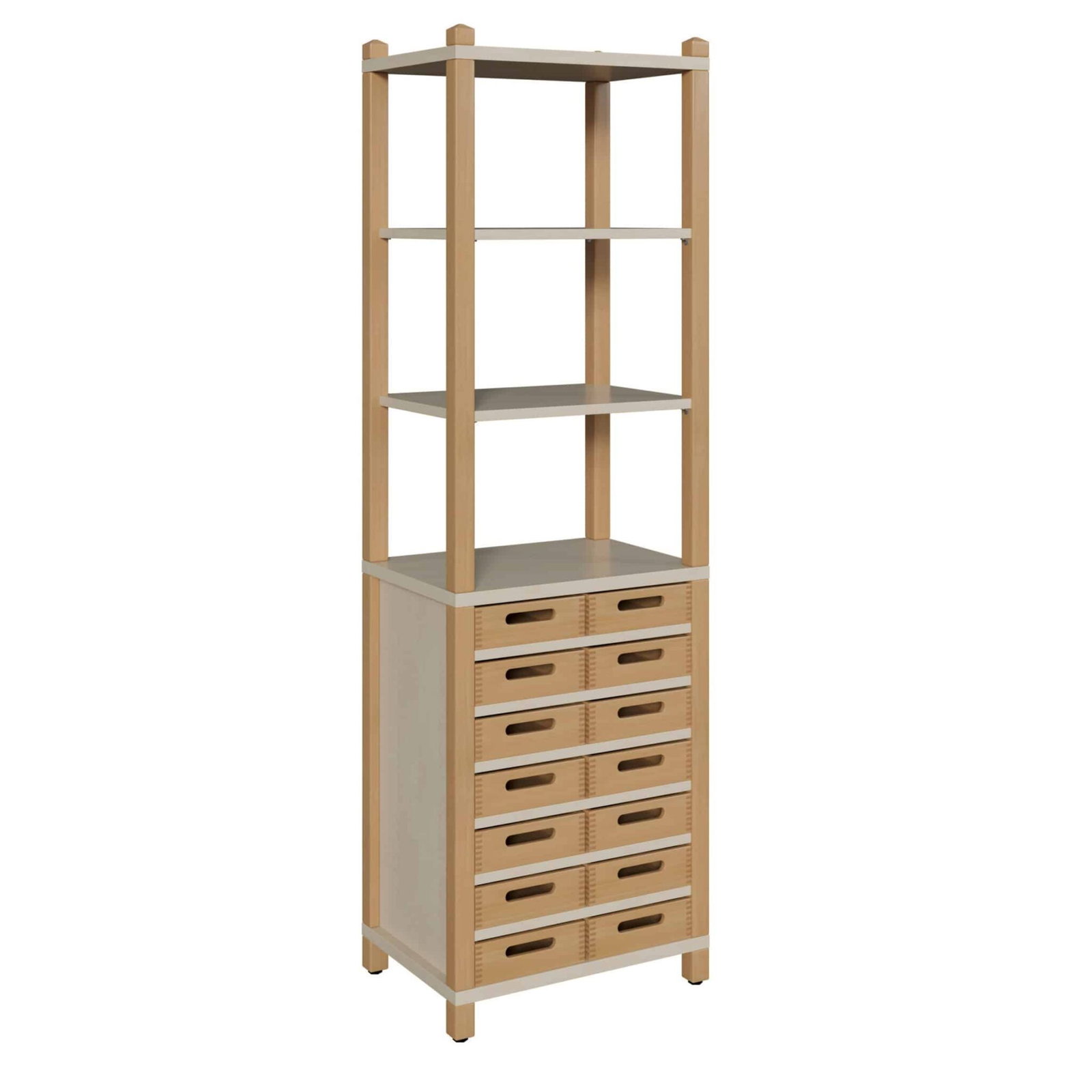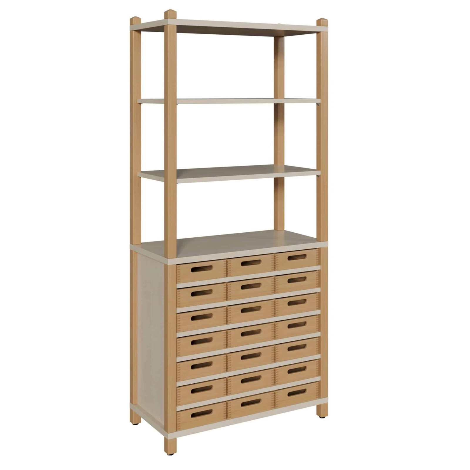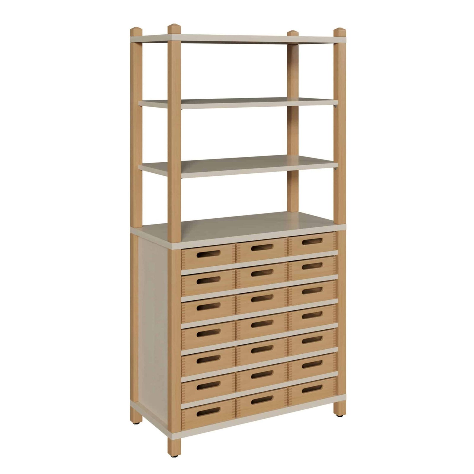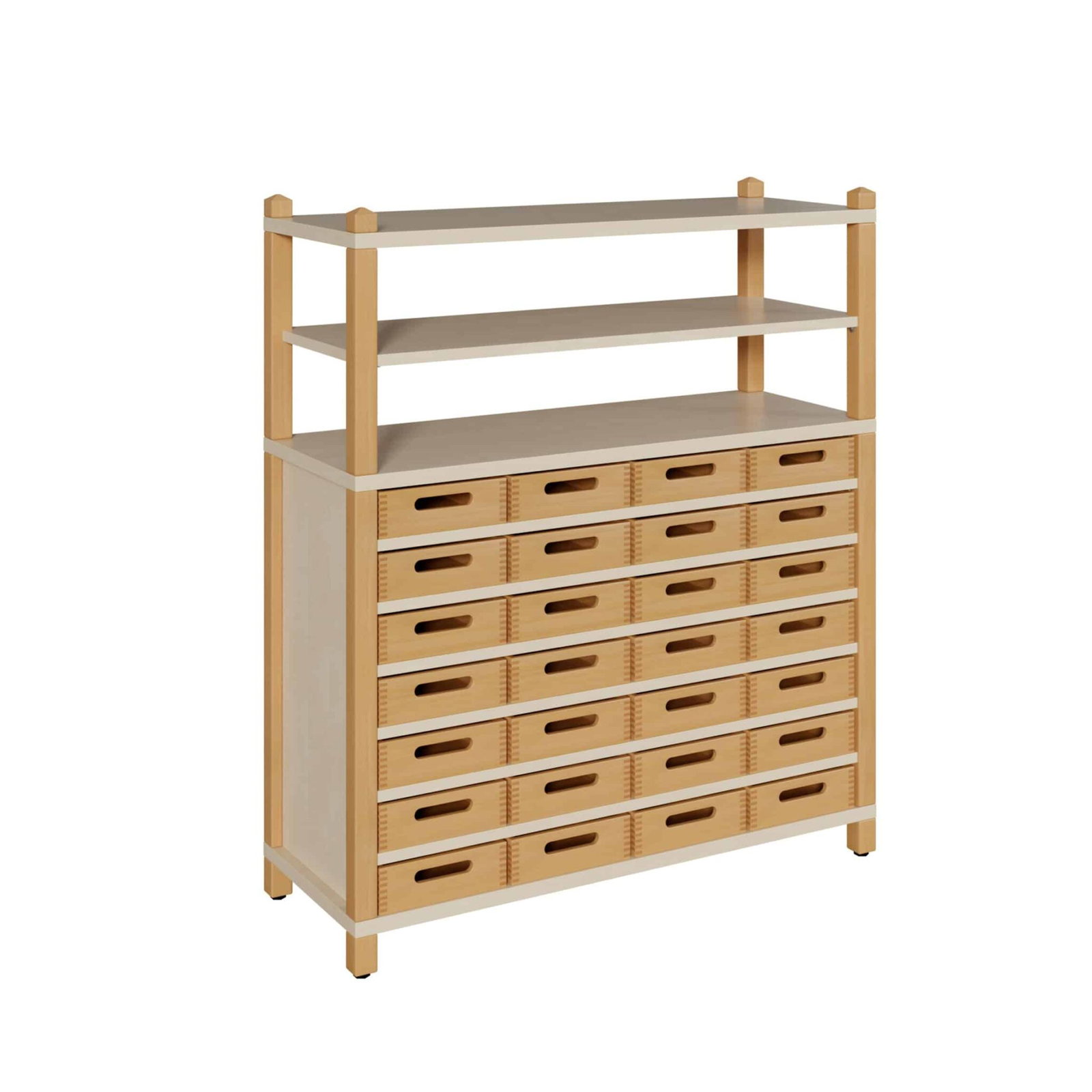 Stollenschrank mit flachen Massivholzkästen und Regalaufsatz für Krippen & Kindergarten
