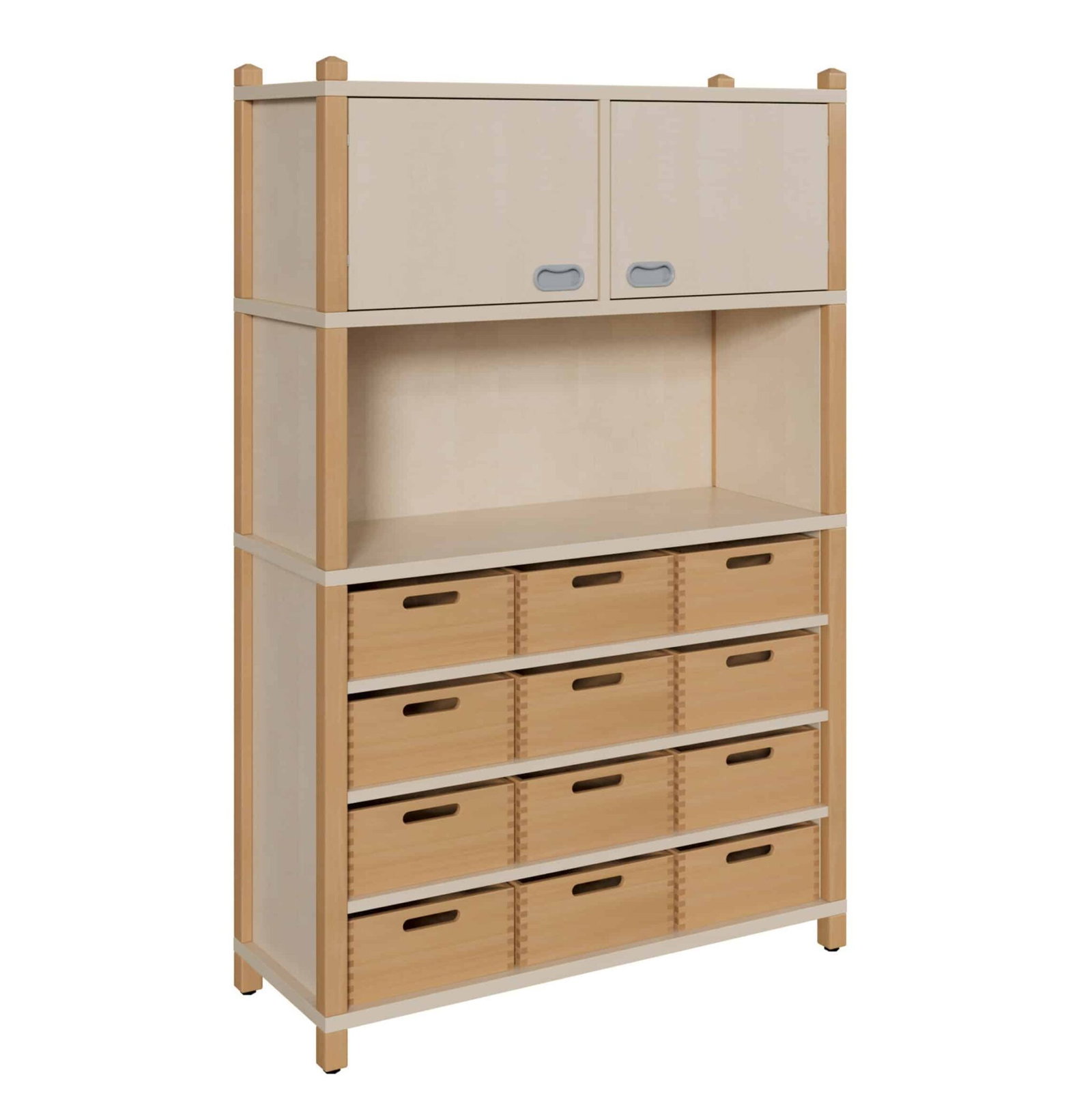 Bringen Sie System und Übersicht in Ihren Gruppenraum mit einem Möbelstück, das für die vielfältigen Anforderungen des Kita-Alltags wie geschaffen ist. Dieser Stollenschrank kombiniert das Beste aus zwei Welten: Zwölf große, robuste Massivholzkästen bieten enorm viel Platz für sperrigere Spielsachen, Bausteine oder Kuscheltiere. Darüber thront ein geräumiger, zweitüriger Oberschrank, der zusätzlichen, blickdichten Stauraum schafft. Die durchdachte, stabile Konstruktion mit Höhenausgleichsfüßen und hochwertigen Materialien macht diesen Schrank zu einer sicheren, langlebigen und unverzichtbaren Lösung für eine organisierte und anregende Umgebung, in der das Aufräumen spielend leicht fällt.