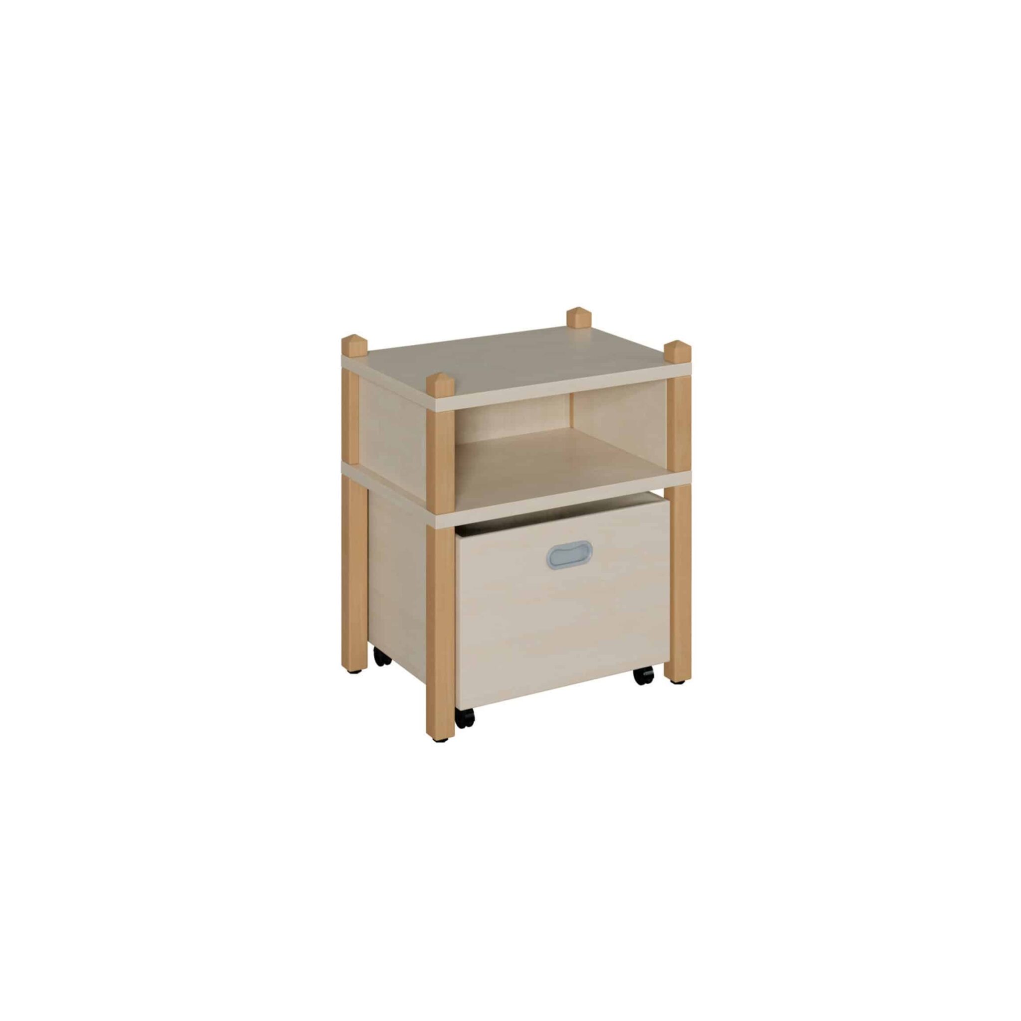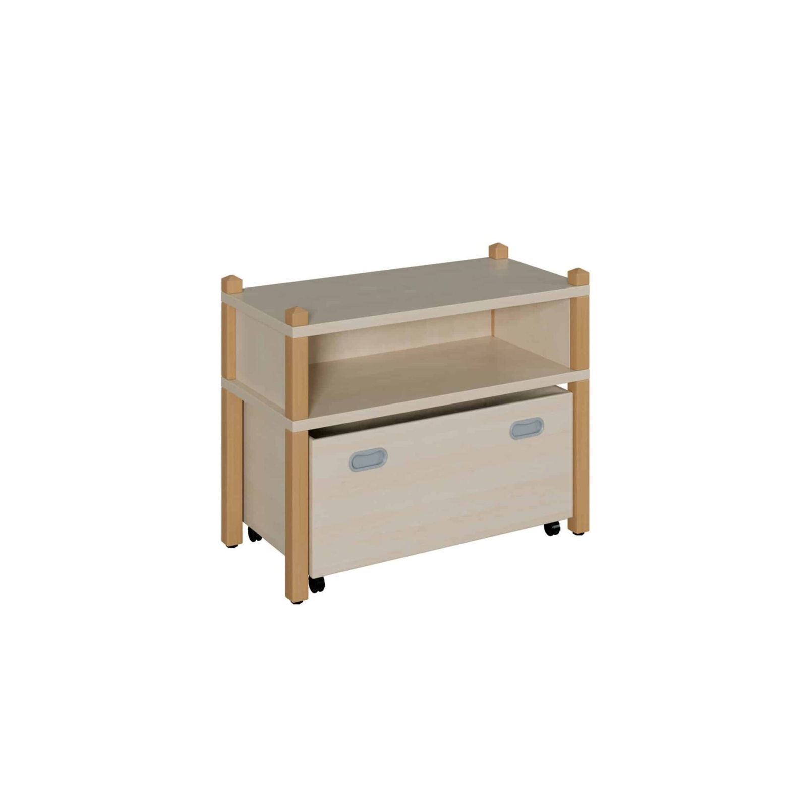 Dieser niedrige Stollenschrank ist ein wahres Multitalent, wenn es darum geht, schon für die Kleinsten eine übersichtliche und einladende Umgebung zu schaffen. Mit seiner kindgerechten Höhe von nur 60 cm wurde er speziell dafür entwickelt, die Selbstständigkeit zu fördern und Ordnung spielerisch zu vermitteln. Die geniale Kombination aus einem großen, mobilen Rollkasten in der Sockelnische und einem offenen Fach darüber bietet die perfekte Mischung aus Stauraum für Spielzeug und einer Präsentationsfläche für Lieblingsbücher oder Greifspiele. Gefertigt mit robusten Elementen aus massivem Buchenholz, ist dieses Möbelstück ein langlebiger, sicherer und ästhetisch ansprechender Begleiter für den Alltag in Krippe, Kita oder Spielgruppe.
