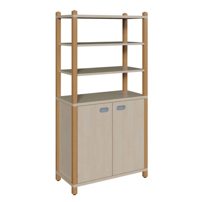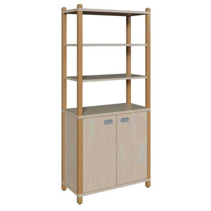 Dieser Stollenschrank ist die Komplettlösung für alle, die in ihren Räumlichkeiten ein Höchstmaß an Ordnung und Struktur anstreben. Er kombiniert einen großzügigen, zweitürigen Schrankbereich im unteren Teil mit einem offenen, praktischen Regalaufsatz. Diese intelligente Aufteilung ermöglicht es, große Mengen an Spielzeug, Bastelmaterialien und Büchern blickdicht und geschützt zu verstauen, während häufig genutzte Gegenstände im oberen Bereich stets griffbereit bleiben. Die Konstruktion nutzt die volle Raumhöhe und schafft so enormen Stauraum auf geringer Grundfläche. Gefertigt mit robusten Massivholzelementen aus Buche, ist dieses System eine ebenso langlebige wie ästhetische Wahl für jede Kita.
