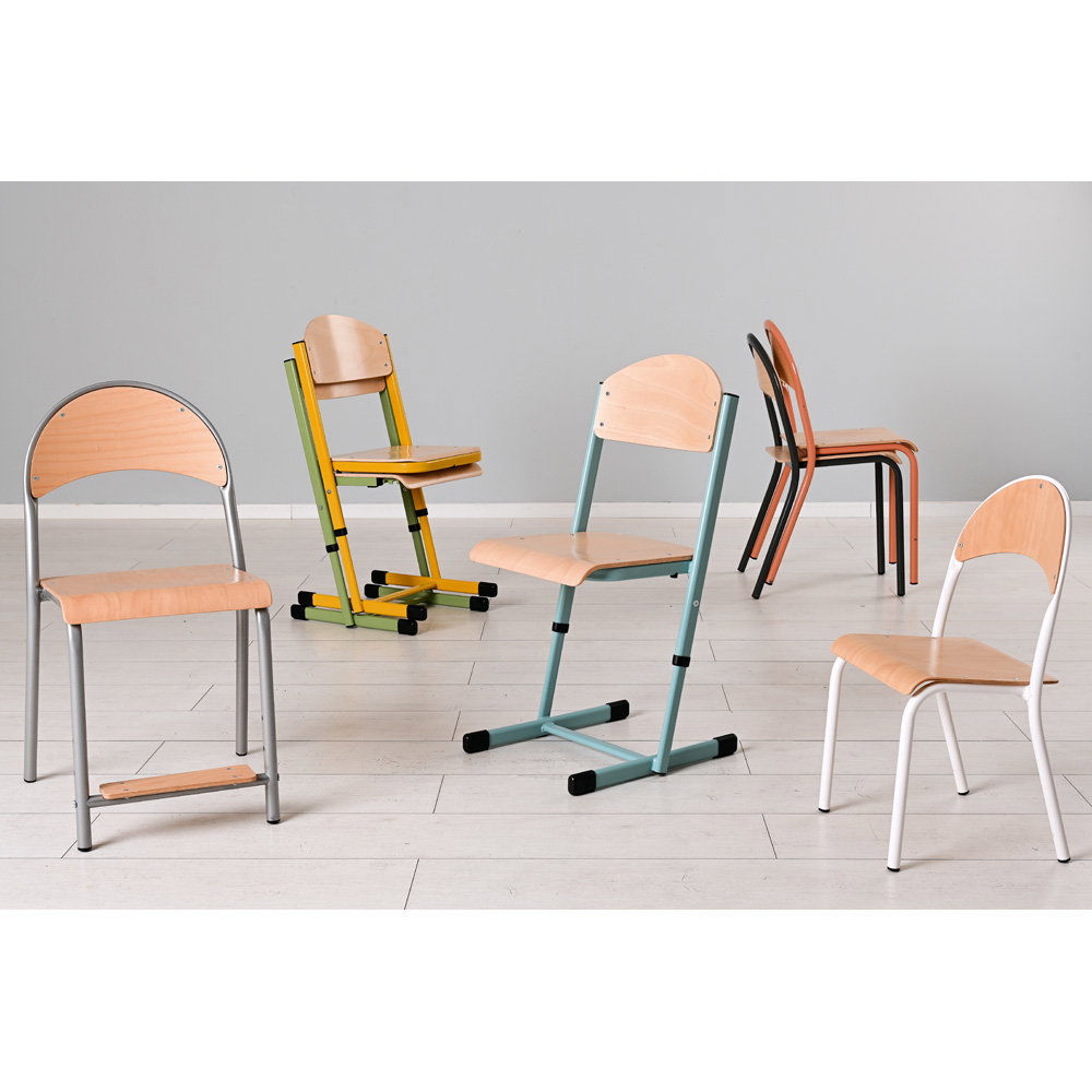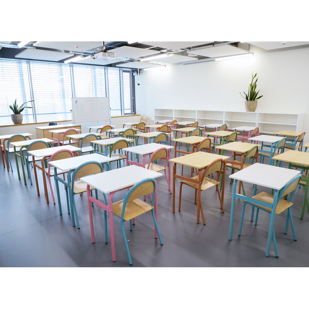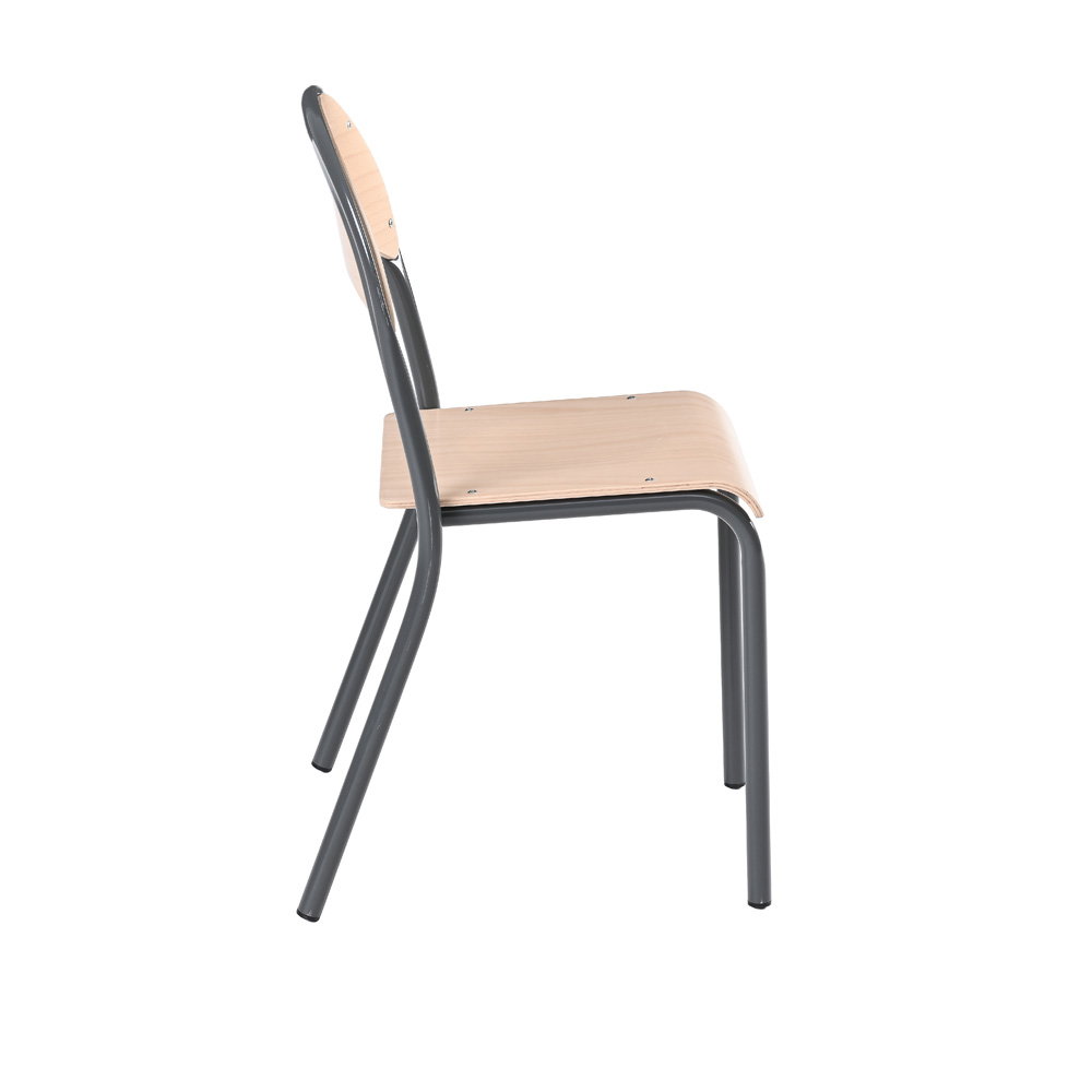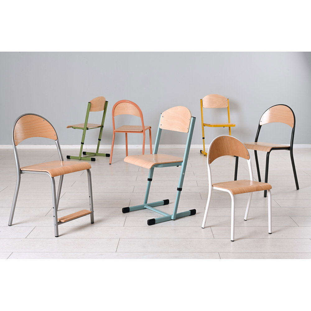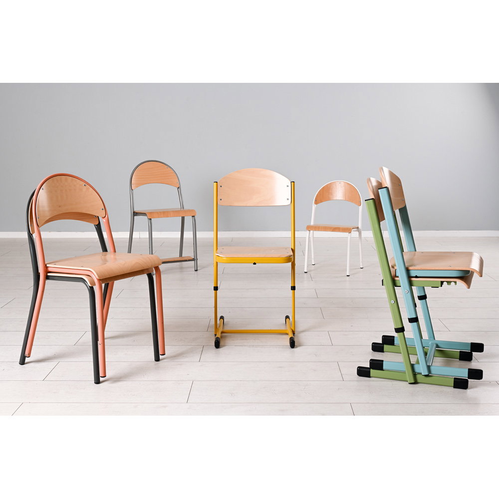 Die durchdachte Konstruktion mit den nach hinten ausgestellten Beinen sorgt für einen felsenfesten Stand. Dieser Stuhl hält auch lebhaften und dynamischen Situationen im Klassenzimmer stand. - Platzsparend und schnell stapelbar