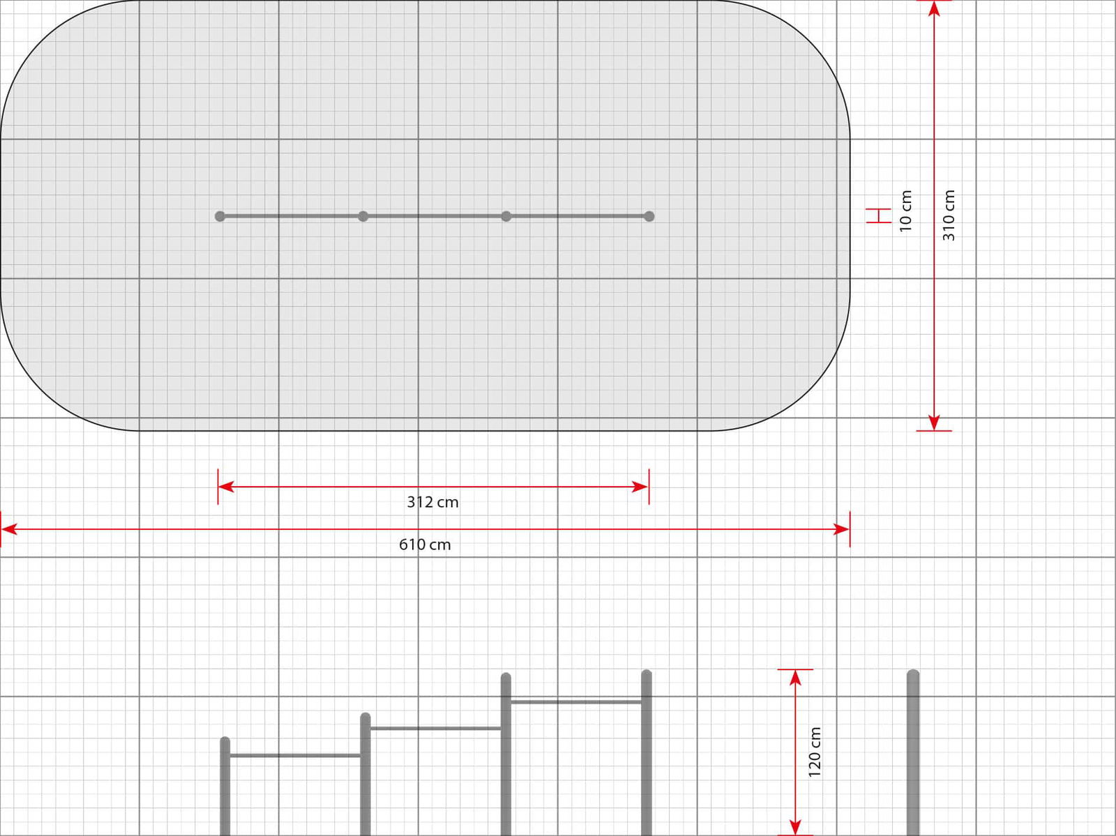 - Platzbedarf inkl. Sicherheitsabstände (LxB): 610 x 310 cm