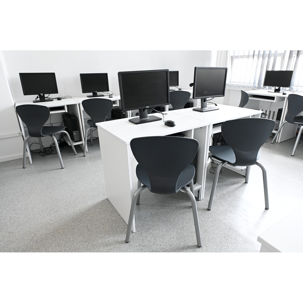 Die leicht federnde Rückenlehne passt sich natürlich dem Körper an und ermöglicht flexible Bewegungen beim Sitzen. Die breite Sitzfläche des Stuhl Flexi unterstützt optimal Becken und Wirbelsäule, sodass auch lange Schultage bequem überstanden werden können. Die weit ausgestellten Stuhlbeine sorgen zudem für maximale Standsicherheit. Der Stuhl ist äußerst robust, schmutz- und wasserabweisend und eignet sich somit hervorragend für den intensiven Einsatz in Schulen und Kindergärten. Stuhlkappen verhindern zuverlässig Kratzer auf dem Fußboden.
