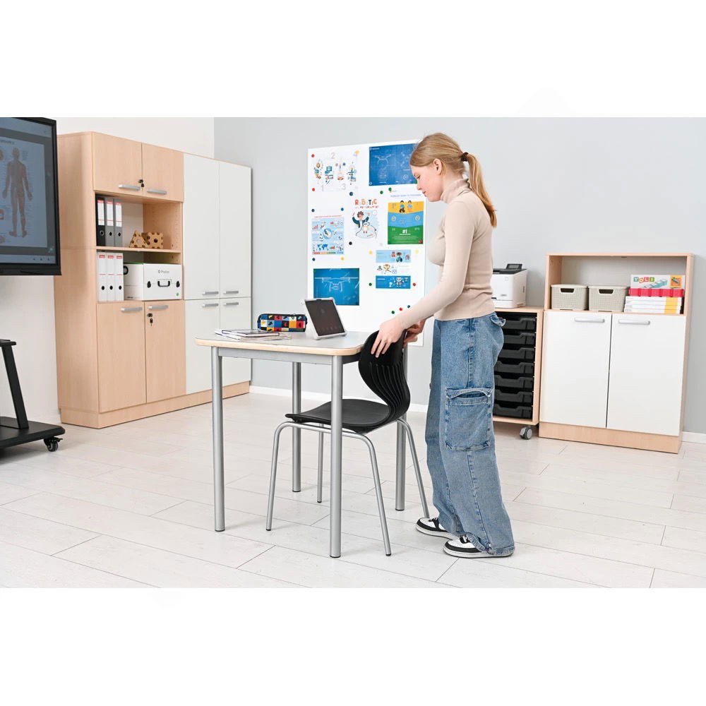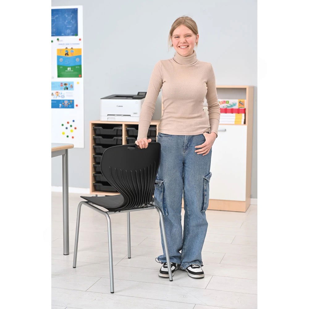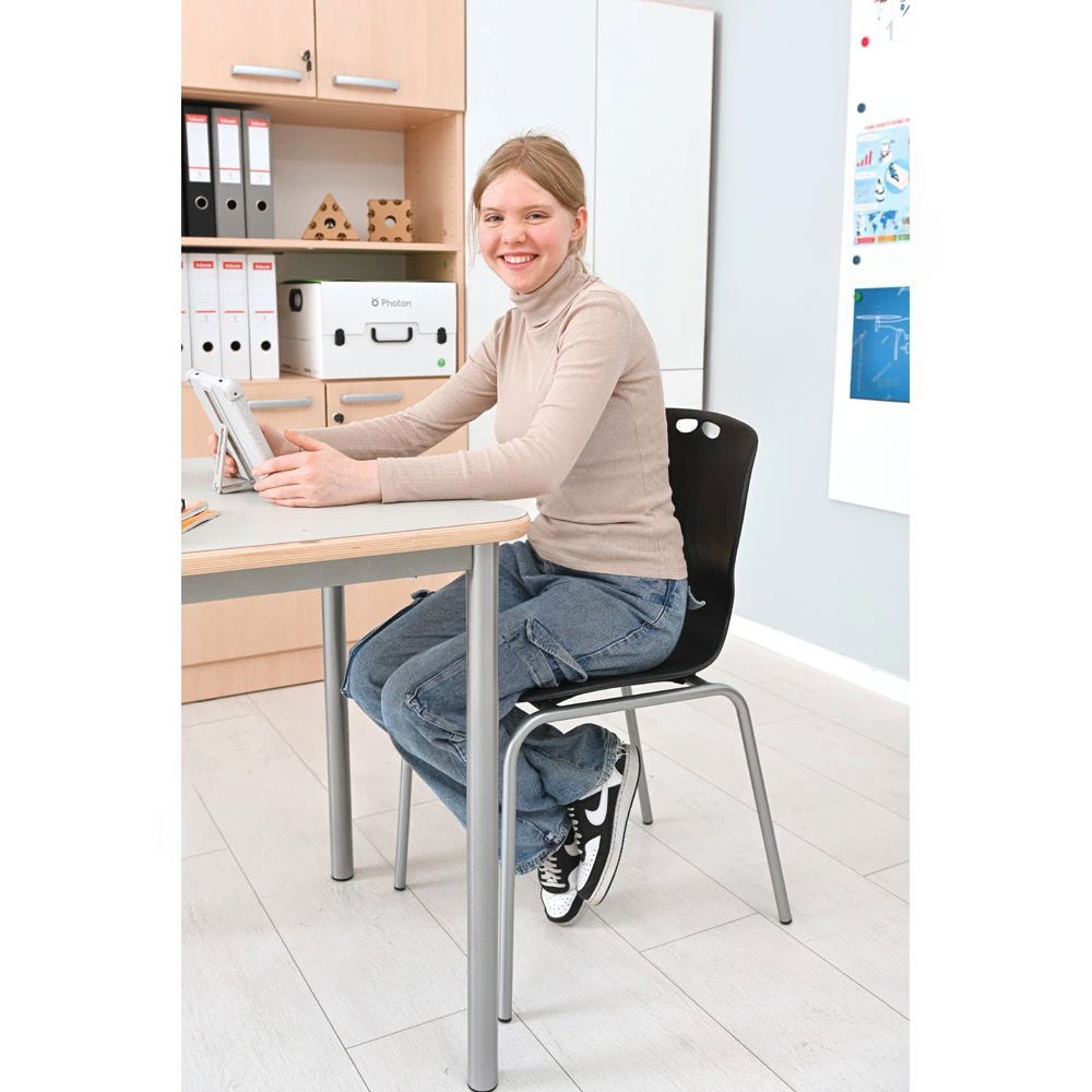 Sicherheit hat oberste Priorität. Die weit nach hinten ausgestellten Stuhlbeine sorgen für eine außergewöhnlich hohe Standsicherheit und verhindern ein leichtes Kippen des Stuhls nach hinten – selbst wenn es im Klassenraum mal etwas turbulenter zugeht. Das robuste Metallgestell hält auch intensiver Beanspruchung stand. - Robustheit für den täglichen Einsatz