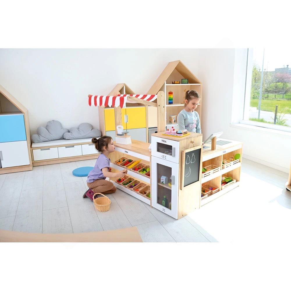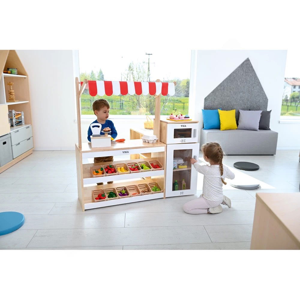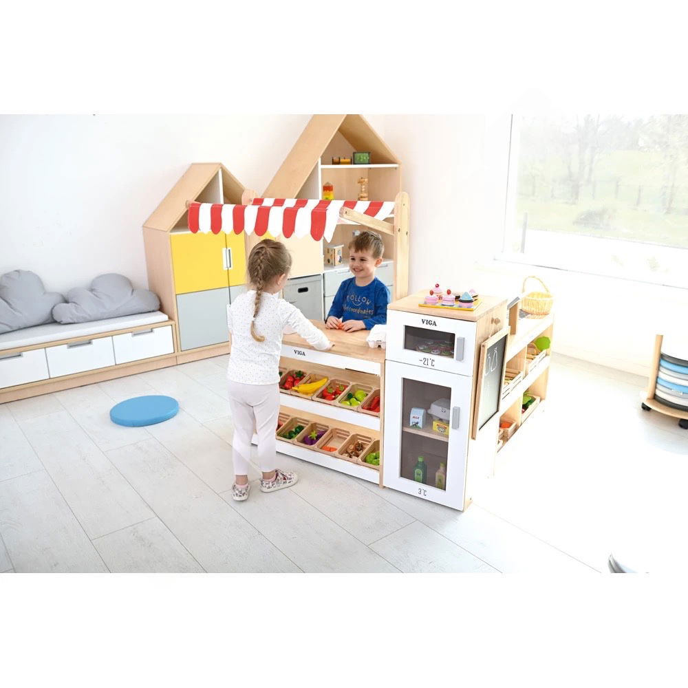Ob Joghurt, Milch, Eis oder frisches Gemüse – gekühlte Waren dürfen in keinem Supermarkt fehlen. Der Supermarkt – Kühlschrank ist die perfekte Ergänzung für jede Kaufladen-Spielecke und bringt eine neue Ebene des realistischen Rollenspiels in den Kindergarten oder das heimische Spielzimmer. Als Teil einer robusten und durchdachten Ladeneinrichtung ermöglicht dieses Möbelstück den Kindern, den Umgang mit frischen Lebensmitteln spielerisch zu erlernen.