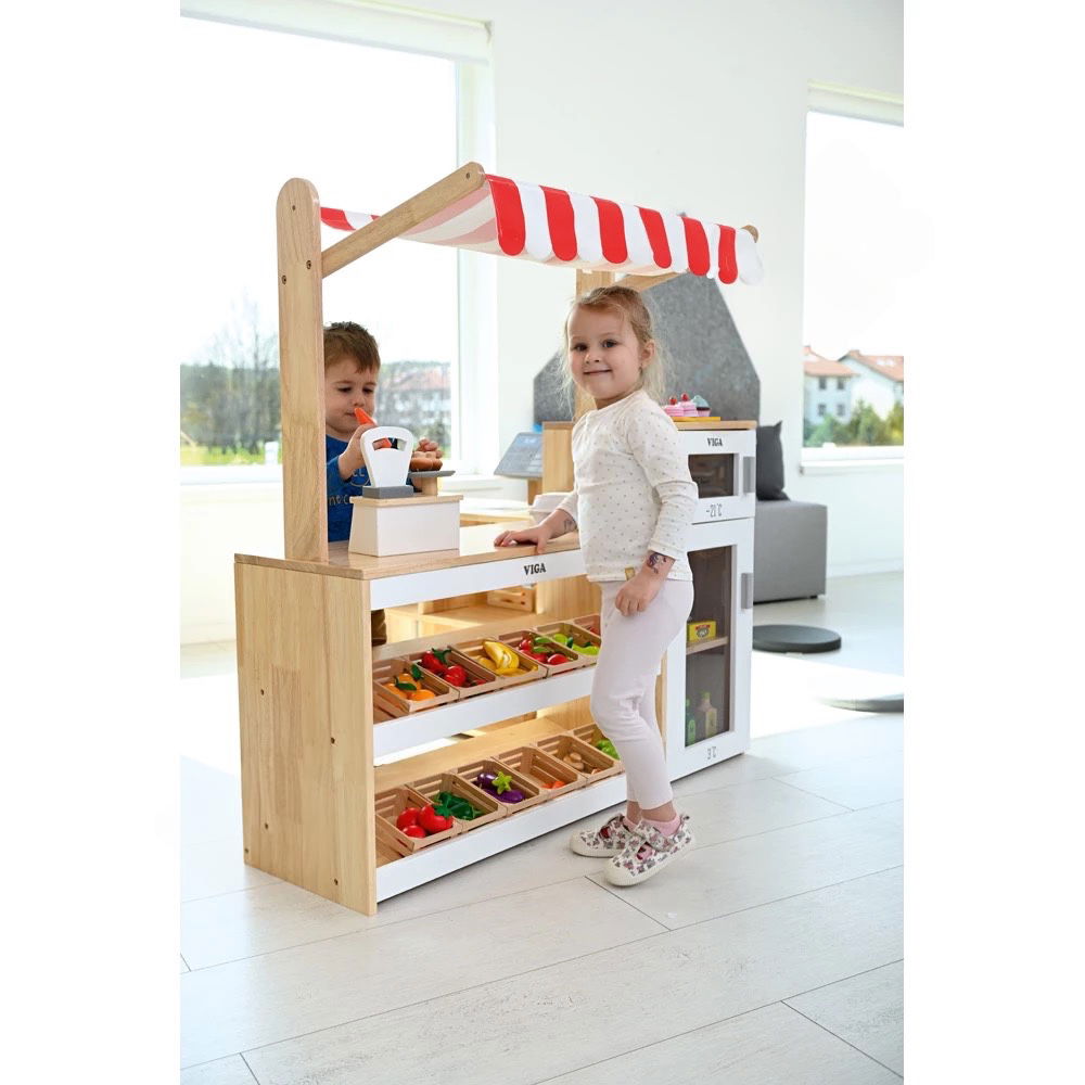 Die seitlich angebrachte Kreidetafel ist eine Einladung zur Kreativität. Ob als Werbetafel für das „Angebot der Woche“, als Notizblock für die Einkaufsliste oder einfach als Malfläche – hier können Kinder ihre Schreib- und Zeichenkünste frei entfalten. - Robuste und sichere Konstruktion
