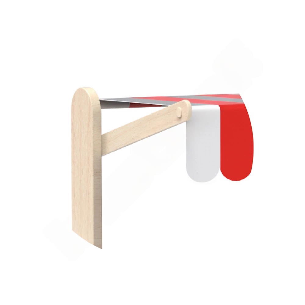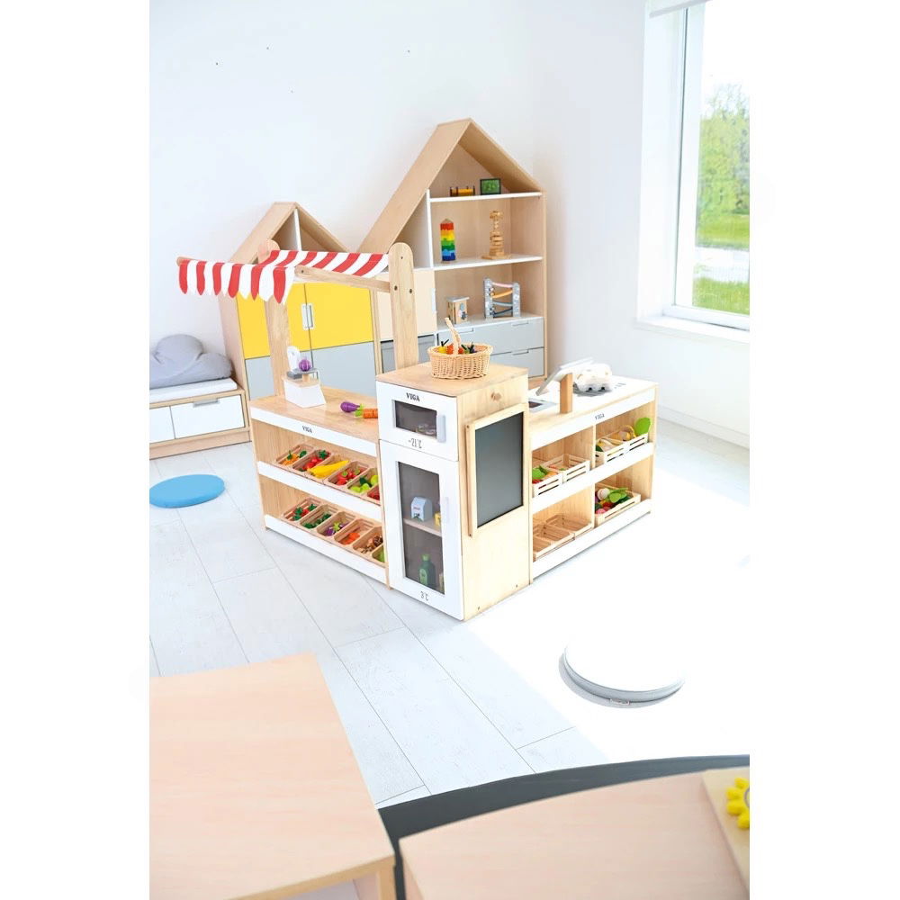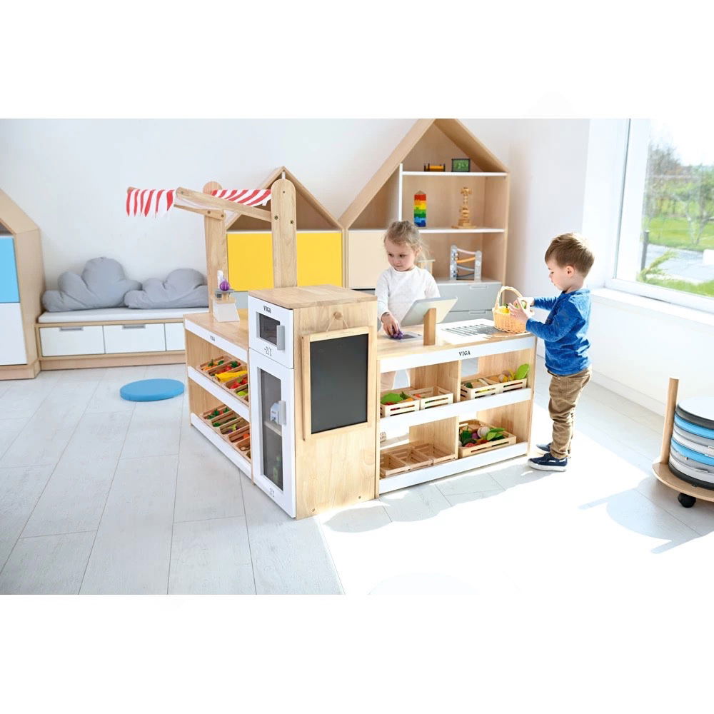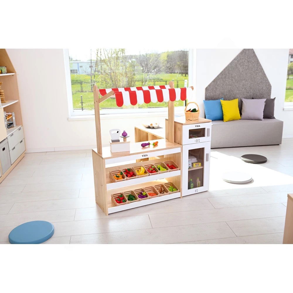 Das Design überzeugt durch liebevolle Details: Eine charmante Textil-Markise schützt die imaginären, frischen Produkte symbolisch vor der Sonne und verleiht dem Regal echten Markt-Charakter. Die offenen Fächer sind so angeordnet, dass sie für Kinder leicht erreichbar sind und zum Sortieren und Ordnen einladen. Ob Obst, Gemüse, Verpackungen oder Spielzeugartikel – hier findet alles seinen Platz. Gefertigt aus hochwertigem Holz und ergänzt durch stabile Kunststoff- und Textilelemente, ist dieses Möbelstück speziell für die hohen Anforderungen in pädagogischen Einrichtungen konzipiert. Es lässt sich hervorragend einzeln nutzen oder modular mit der passenden Kasse und dem Kühlschrank (separat erhältlich) zu einem kompletten Supermarkt erweitern.