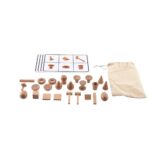 - Inhalt: 4 Bingo-Karten (18 x 12 cm), 24 Holzformen (2-5 cm), 1 Baumwollbeutel