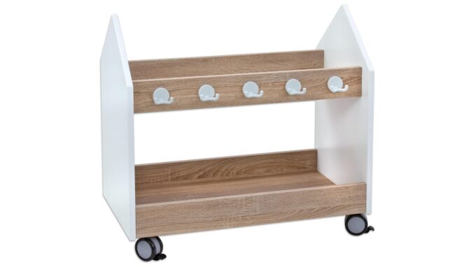 Der Taschenwagen verfügt über zwei geräumige Ablagefächer, die zusätzlichen Stauraum für größere Gegenstände bieten. Zusätzlich können Sie zwischen 10 oder 16 stabilen Doppelhaken wählen, um alles, was Ihre Kinder sammeln, sicher aufzuhängen. Der Abstand zwischen den Doppelhaken beträgt 84 mm, sodass genügend Platz für alle Taschen vorhanden ist. Der modern gehaltene Eichedekor verleiht dem Taschenwagen eine ansprechende Optik und fügt sich nahtlos in jedes Ambiente ein.