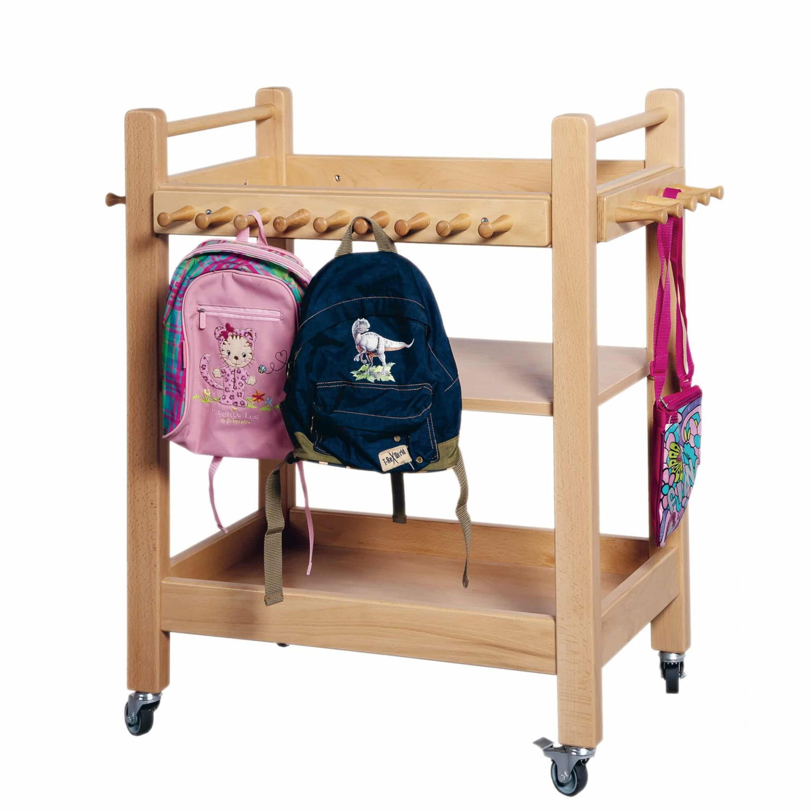Der Taschenwagen ist die perfekte Lösung für alle Bildungseinrichtungen, die Wert auf natürliche Materialien, kompakte Mobilität und durchdachte Organisation legen. Dieser vielseitige Helfer aus massivem Buchenholz verwandelt jeden Raum in eine perfekt organisierte Zone für Brottaschen, kleine Rucksäcke, Jacken und alle kleinen Dinge, die schnell zur Hand sein müssen. Mit seinen 28 robusten Holzhaken auf vier umlaufenden Leisten und drei praktischen Ablageebenen bietet er maximale Kapazität auf minimalem Raum. Die kompakten Abmessungen von nur 83,5 x 86,3 x 57,5 cm machen ihn zum idealen mobilen Begleiter, der dank seiner vier Rollen flexibel dort eingesetzt werden kann, wo er gerade gebraucht wird. Die natürliche, farblos lackierte Buchenoberfläche fügt sich harmonisch in jede Einrichtung ein und unterstreicht den nachhaltigen Ansatz moderner Pädagogik.