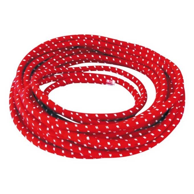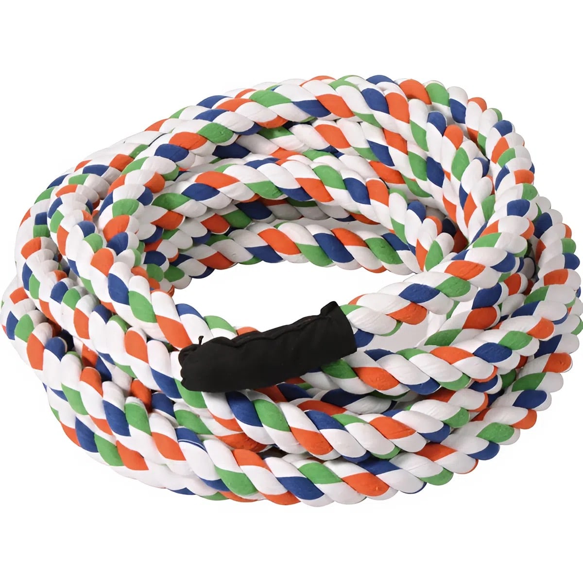 - Weißes Baumwolltau (Indoor): Aus kräftigen Baumwollsträngen gefertigt, ist dieses Tau besonders griffig und liegt angenehm weich in der Hand. Es eignet sich perfekt für den Einsatz in der Halle oder im Turnsaal. Die ummantelten Enden verhindern ein Ausfransen und die rote Markierung in der Mitte zeigt den Sieger beim Tauziehen an.