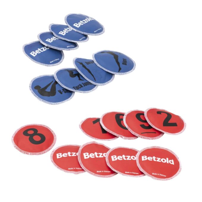 - 10 rote Bohnensäckchen mit Zahlen, 10 blaue Bohnensäckchen mit Übungen.