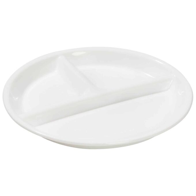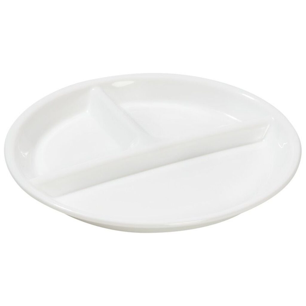 Weiße Hartglasteller mit Fächern – Für den robusten Einsatz konzipiert. Diese Teller aus weißem Hartglas mit praktischen drei Fächern sind perfekt für die anspruchsvollen Anforderungen des Alltags ausgerichtet. Sie erweisen sich als ideal im Umgang mit Kindern, indem sie es ermöglichen, unterschiedliche Speisen getrennt zu servieren und so eine ausgewogene Ernährung zu fördern. Mit stabilen hohen Rändern ausgestattet, erleichtern sie auch kleinen Kindern das selbstständige Essen, indem die Nahrung leichter auf dem Löffel oder der Gabel platziert werden kann, ohne darüber hinauszufallen.