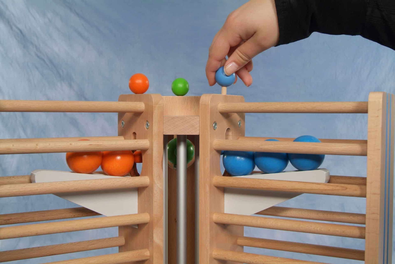 Spannender Wettkampf mit bunten Kugeln: Schon für Kinder ab 4 Jahren in Hort, Kindergarten, Krippe oder Schule ist Tempora ein Spiel, das sinnvoll beschäftigt. Es fördert Fingerfertigkeit, Freude am gemeinsamen Spiel, Geschicklichkeit und Konzentration. Es empfiehlt sich sogar für Therapie und Pflege bei Erwachsenen. Egal, ob als Wettkampfspiel oder um seine Fingerfertigkeit zu trainieren, Spaß macht dieses Holzspiel allemal. Es besteht aus dem 75 cm hohen Holzturm mit drei Spielfeldern und neun massiven Holzkugeln aus Buche. Je drei Kugeln in Blau, Grün und Orange gehören zu diesem spannenden Geschicklichkeitsspiel. Die Kugeln müssen durch die Sprossen nach oben und in eine schräge Rampe transportiert werden. Wenn alle drei Kugeln in der Rampe sind, darf ein Stöpsel sie freigeben. Sie sausen wieder zum Ausgangspunkt zurück. Denjenigen, der seine drei Kugeln am schnellsten von unten nach oben und zurück bringt, erklärt ein Glockenschlag zum Sieger! Es können jeweils zwei bis drei Spielerinnen oder Spieler ihre Fähigkeiten messen und fördern.
