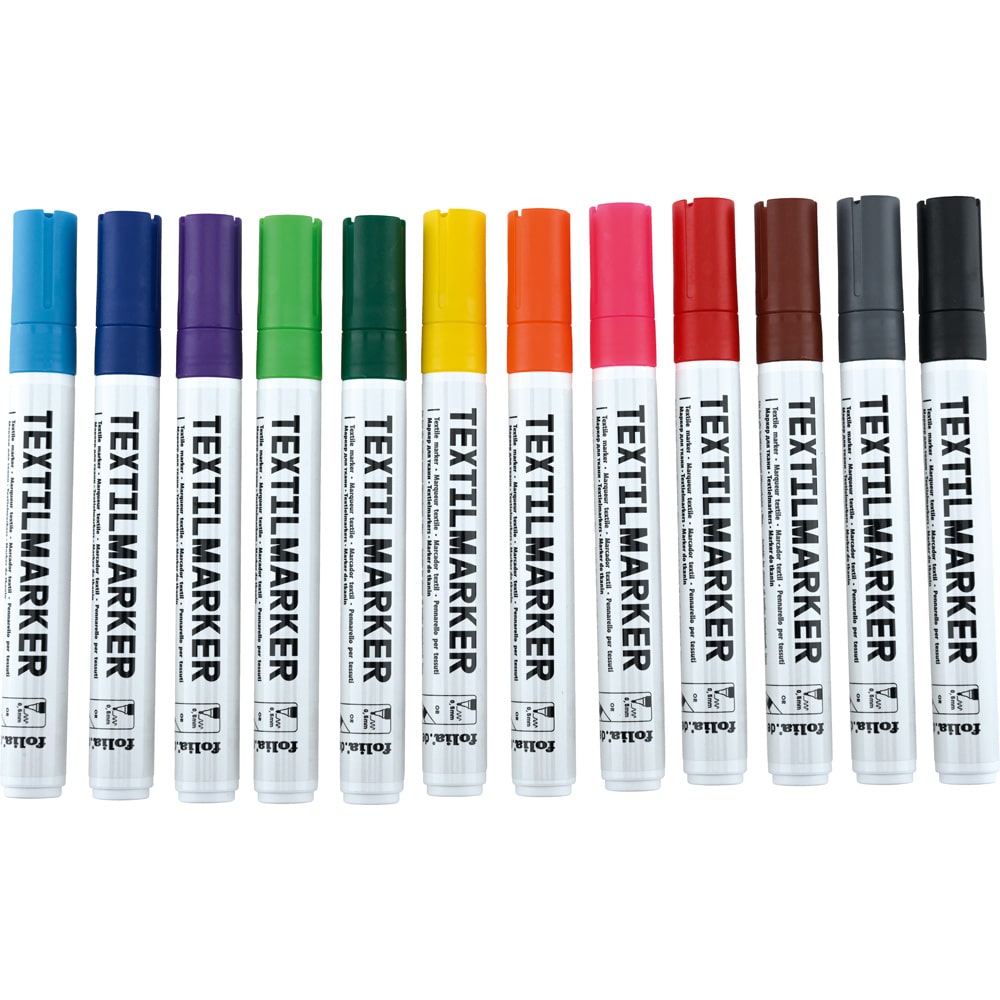 Entdecken Sie Textil-Marker: 12 Farben, 1-4 mm Strichstärke, permanent, wasserfest, lichtbeständig. Ideal für Baumwolle, Leinen, Seide. Jetzt kreativ werden!
