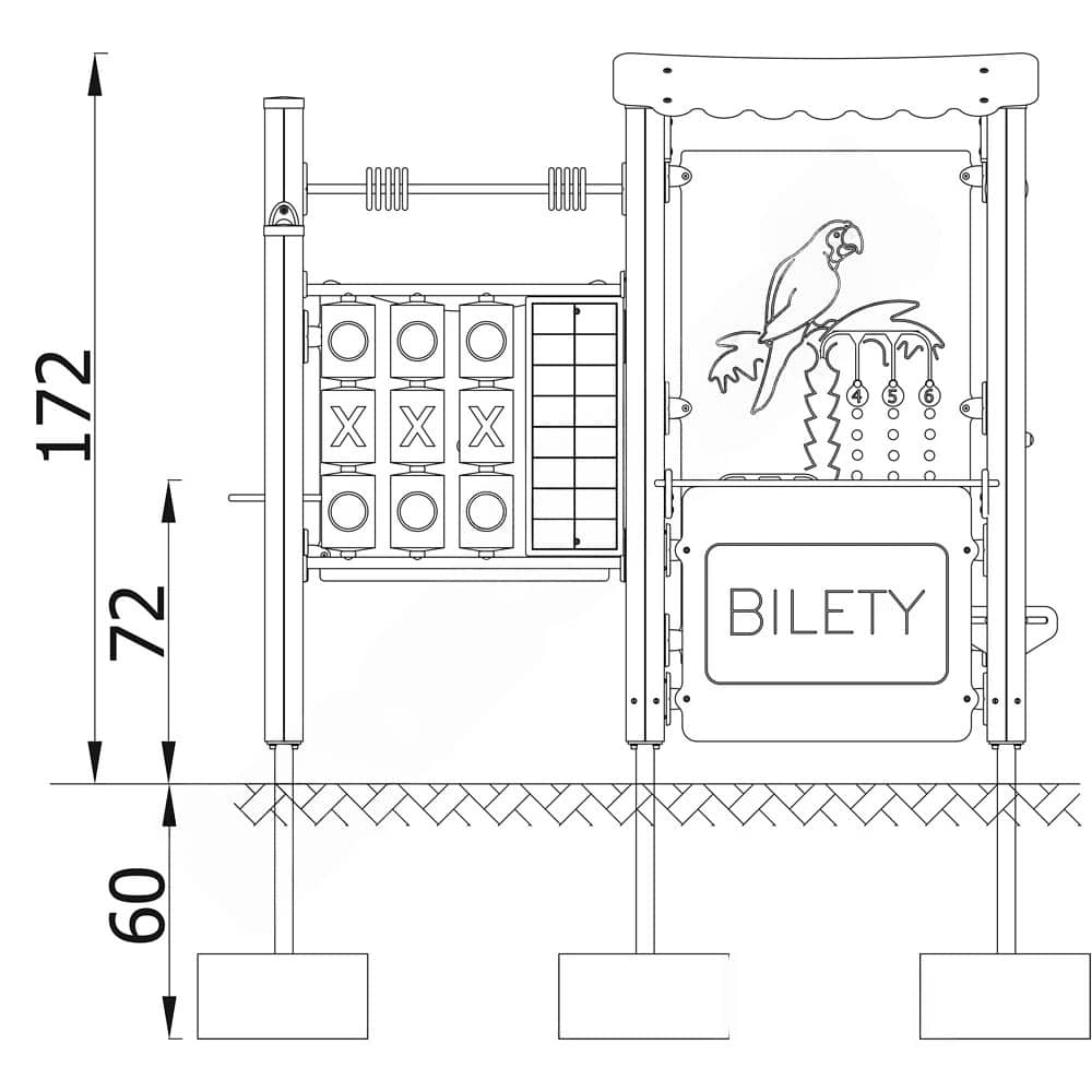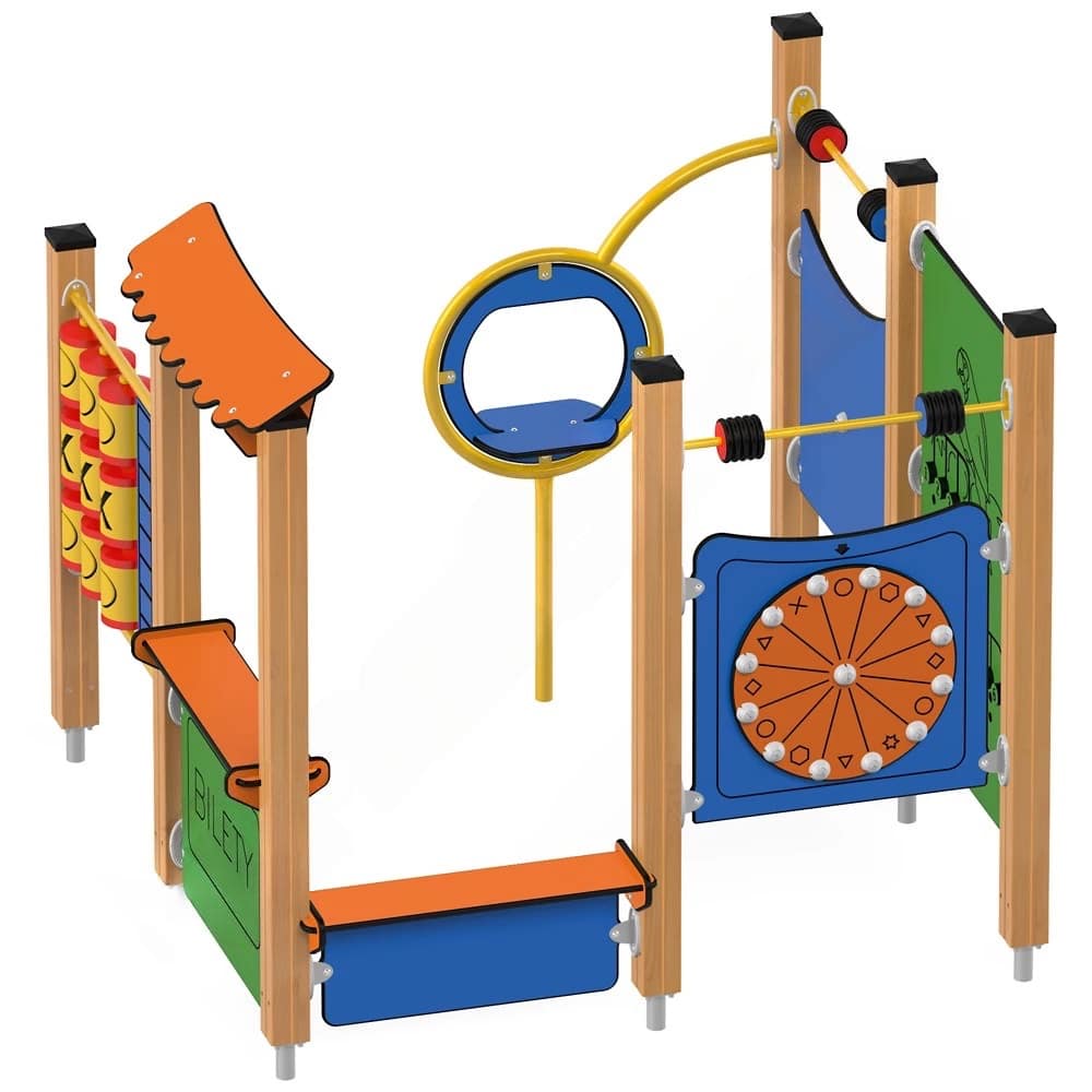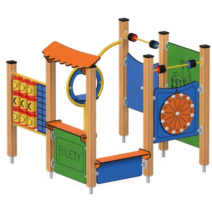 Der Ticket – Schalter ist mit zwei Ladentheken in unterschiedlichen Höhen ausgestattet, was die Interaktion fördert und den Zugang für Kinder jeden Alters erleichtert. Zusätzlich bietet das Spielhaus ein Tic-Tac-Toe-Spiel, Motorikwände, ein Glücksrad, eine Uhr, ein Zahlen-Schiebespiel sowie zwei Abakusstangen, die die Kinder kaum jemals langweilen wird. So können sie spielerisch ihre feinmotorischen und logisch-mathematischen Fähigkeiten entwickeln.