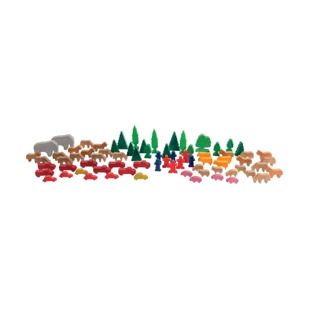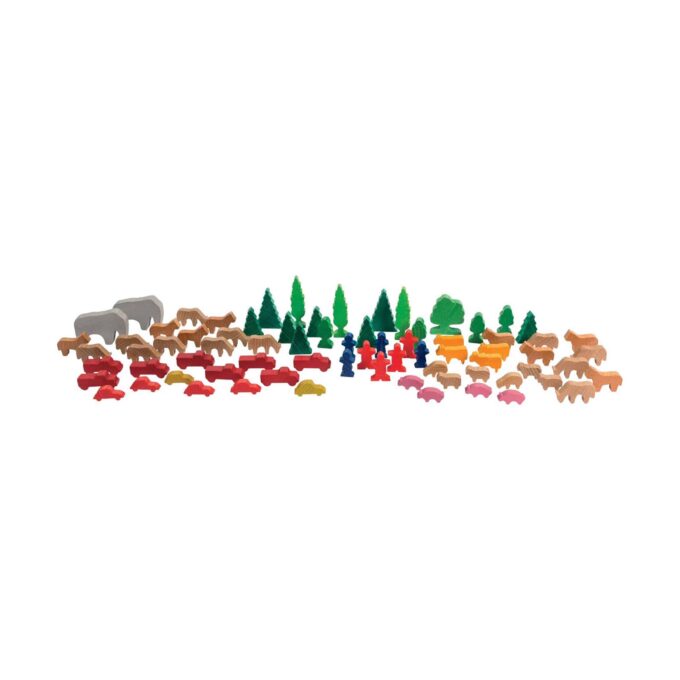 Das Tiere mit Figuren Set von Dusyma ist ein wundervolles Spielzeug-Set, das Kinder dazu einlädt, ihre Kreativität zu entfalten und selbst Geschichten zu gestalten. Die 74 hochwertigen Holzteile sind liebevoll gestaltet und beinhalten eine vielfältige Auswahl an Tieren, Figuren, Bäumen und weiteren Elementen. Die Kombination aus farbig gebeizten und lackierten Oberflächen verleiht den einzelnen Teilen einen harmonischen und ansprechenden Look, der Kinder kreativ inspiriert und sie gleichzeitig sicher spielen lässt.