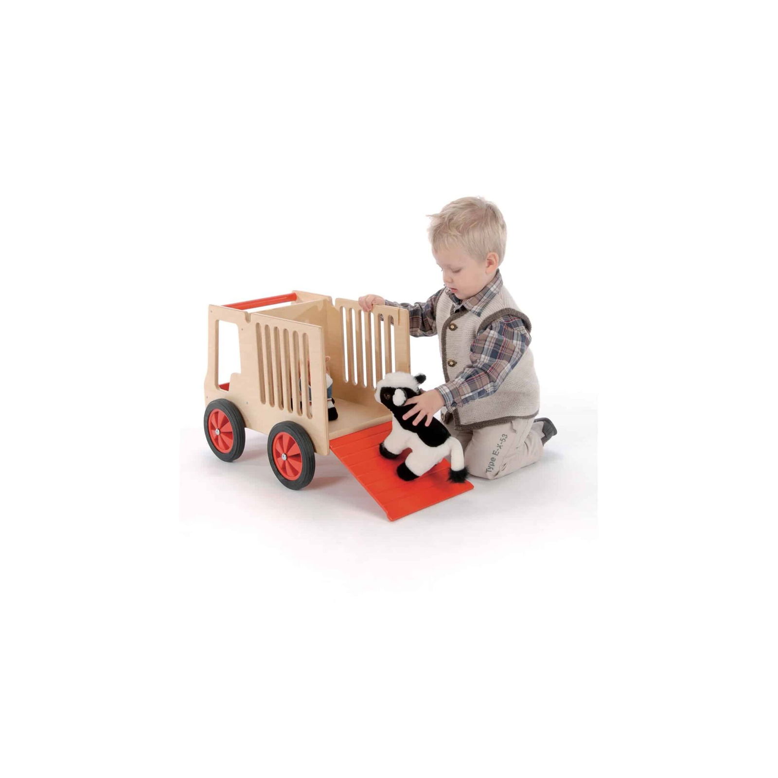 Tiertransporter aus Holz mit ausklappbarer Bordwand. Für unsere kleinen Unternehmer.