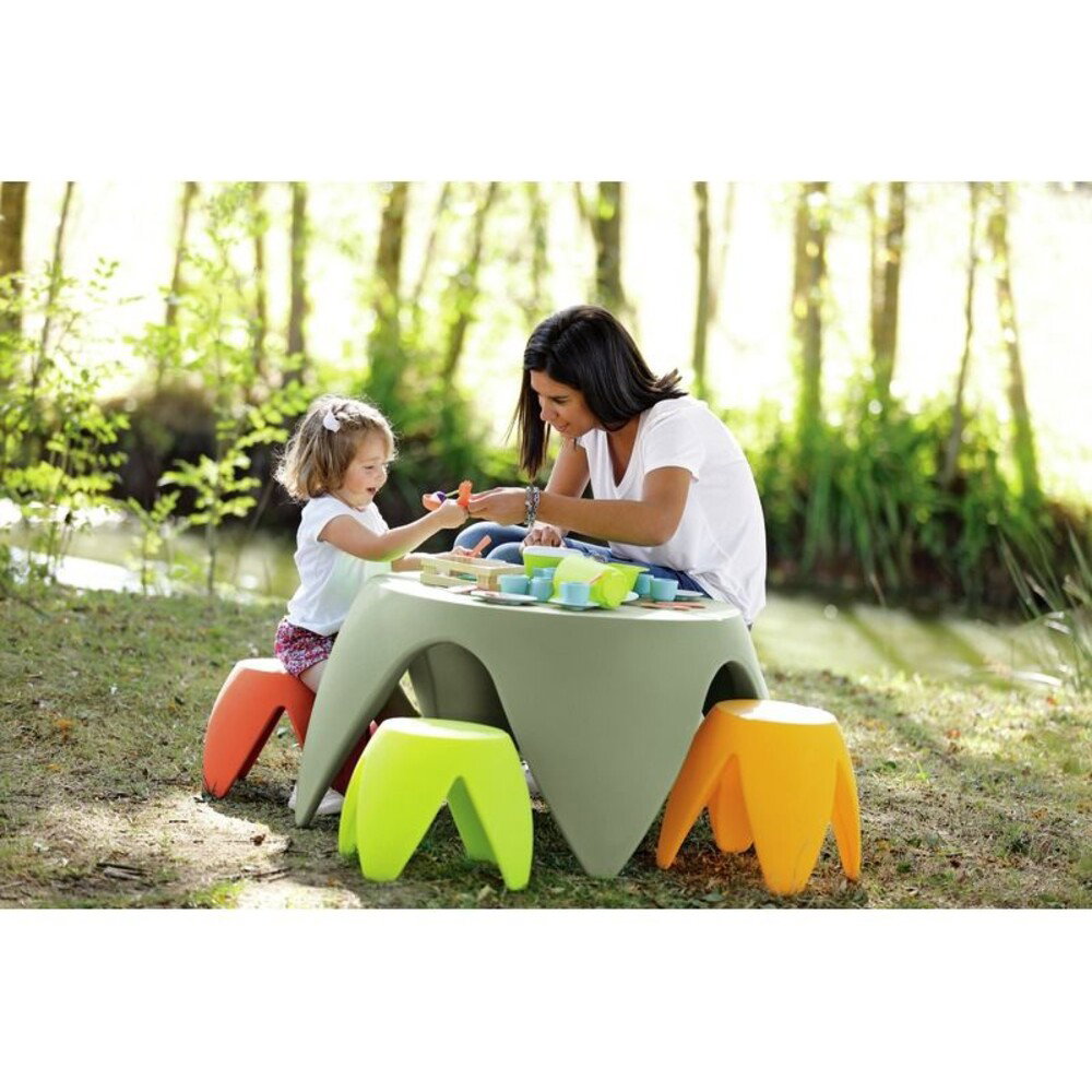 Wenn der Raum einmal für andere Aktivitäten benötigt wird, zeigt der Tisch Flora seine wahre Flexibilität. Sie können bis zu vier Tische absolut sicher und stabil übereinanderstapeln. Mit einem großzügigen Durchmesser von 79 Zentimetern und einer kindgerechten Höhe von 47 Zentimetern bietet er ausreichend Platz für viele kreative Projekte. Wählen Sie aus den ansprechenden Farben Grünblau, Flechte, Dunkelblau und Hellgrau, um Ihre Räume freundlich, bunt und harmonisch zu gestalten. Wir unterstreichen die hohe, in Europa produzierte Qualität dieses Möbelstücks mit einer verlässlichen Garantie von drei Jahren.