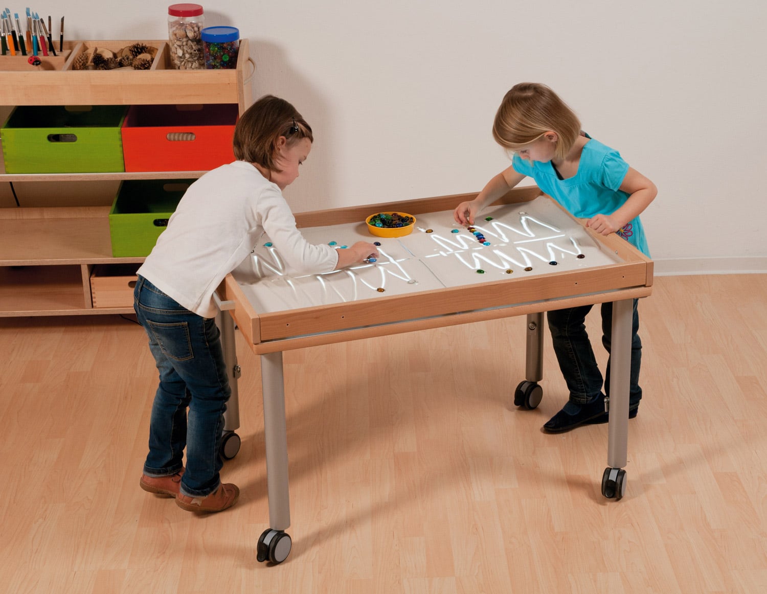 Dieser Tisch verbindet Funktionalität und Design. Durch seine hochwertigen Materialien sowie die stabile Konstruktion aus Hochdruck-Laminat (HPL), Massivholz und Metall wird er zu einer langlebigen Lösung für Schulen, Kindergärten oder kreative Zuhause. Er passt sich den Bedürfnissen dynamischer Lern- oder Spielsituationen an und schafft eine Grundlage, auf der Kinder erkunden, experimentieren und lernen können.
