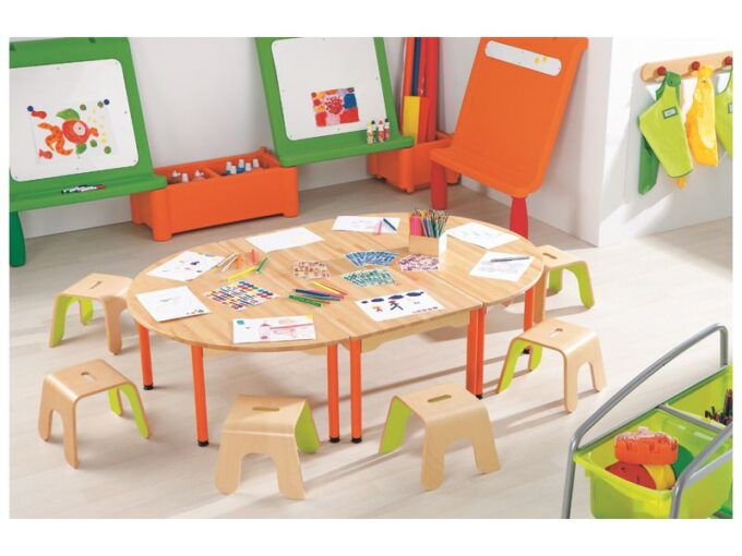 Tisch halbrund – aus 100% massiver Buche – Beine aus Holz für Kindergarten und Krippe