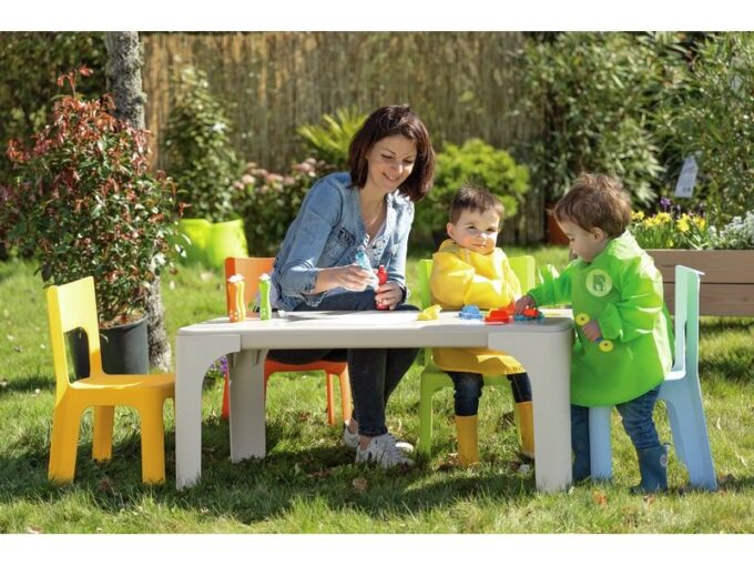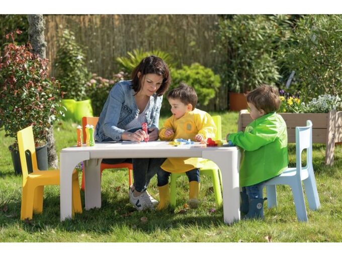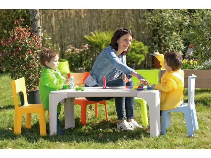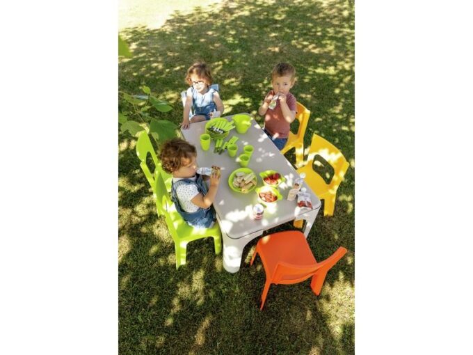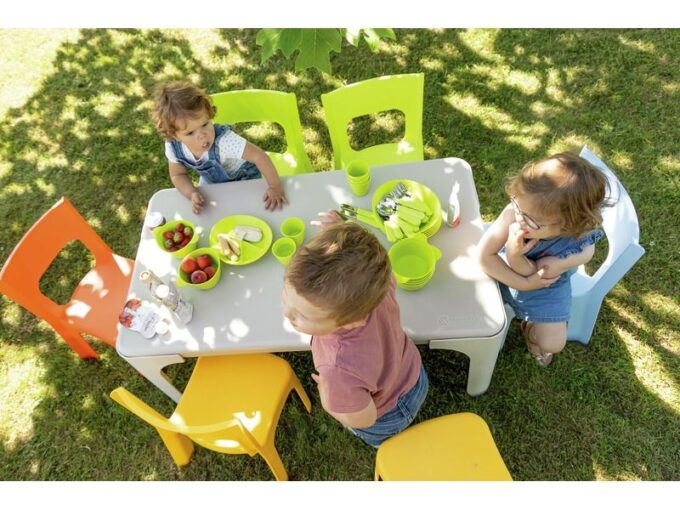 Dank seiner leichten Konstruktion kann der Tisch Lou problemlos von einem Kind bewegt werden. Zusätzlich sind die Tische stapelbar, was für maximale Platzersparnis sorgt – ideal für flexibel genutzte Räume. Die Reinigung ist denkbar einfach: Ein Schwamm und Wasser genügen, um den Tisch hygienisch sauber zu halten, sowohl drinnen als auch draußen.