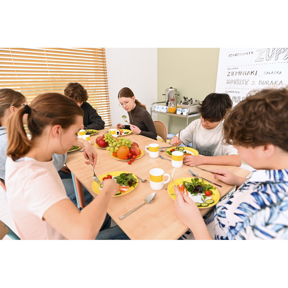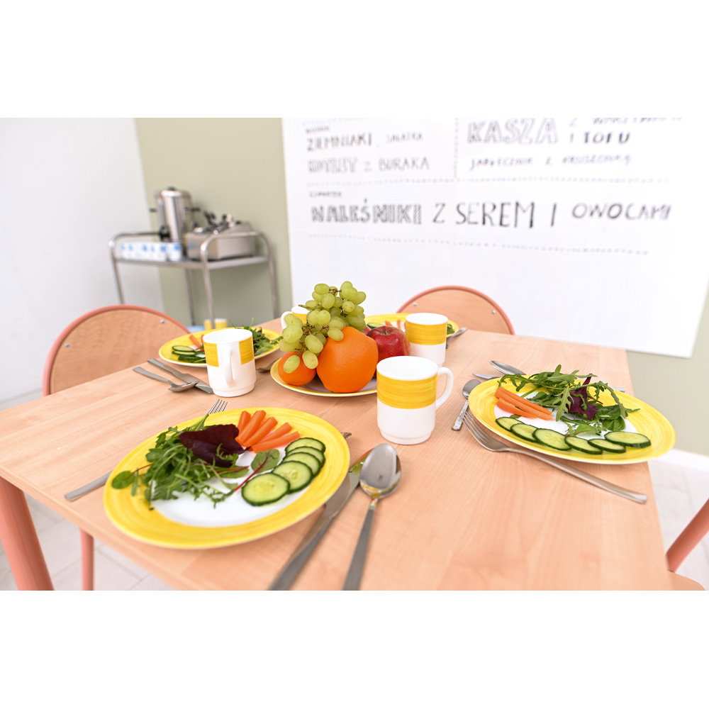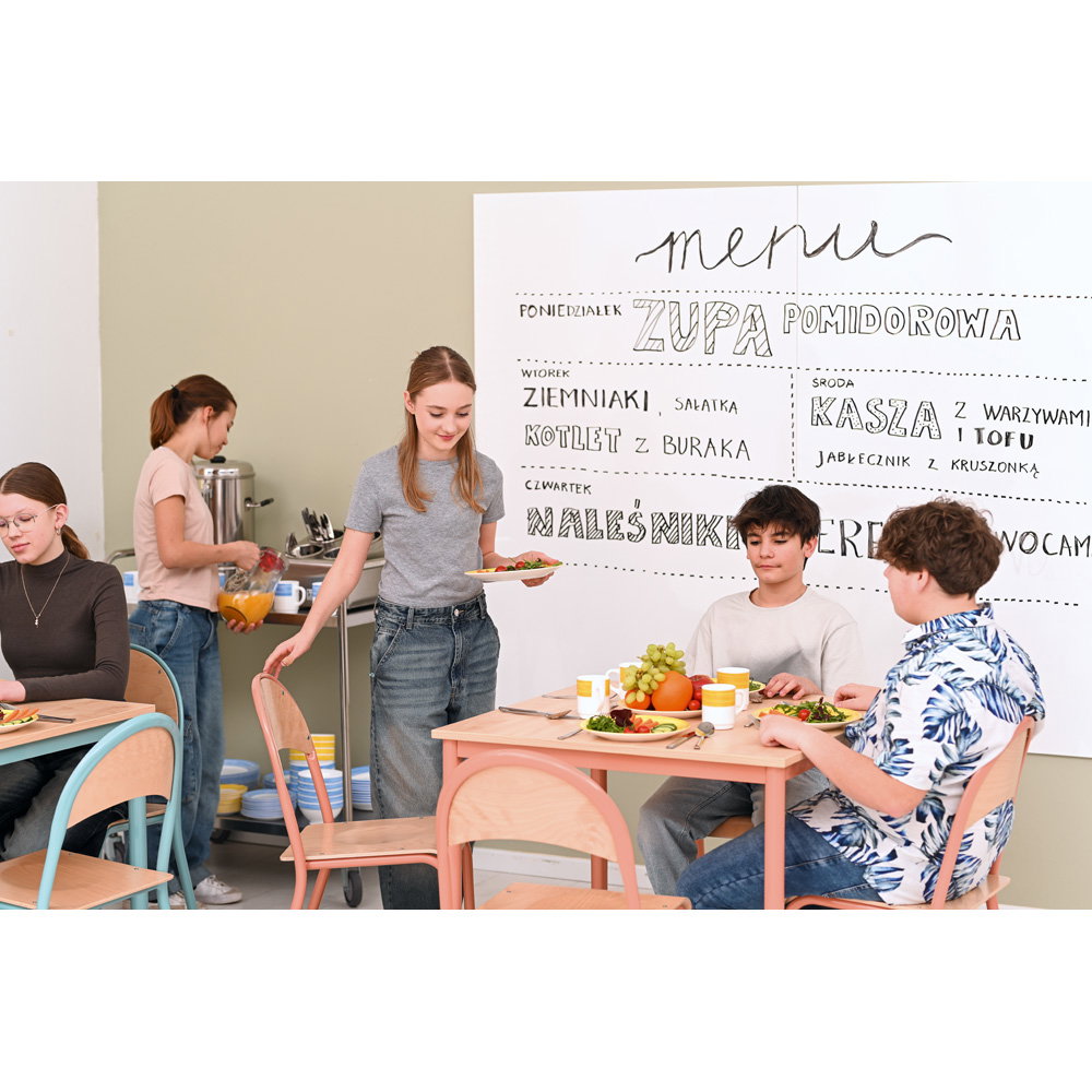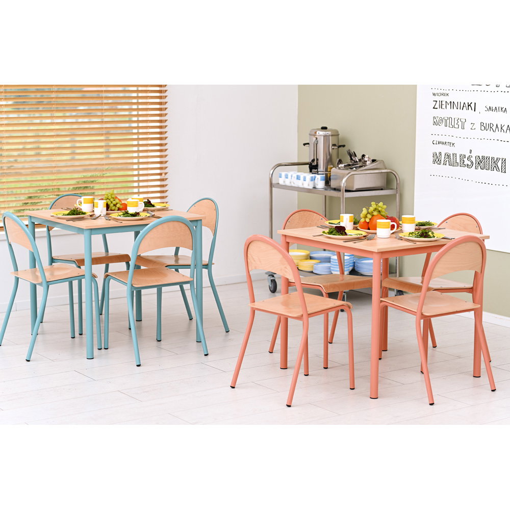 Möbel in Schulen und Seminarräumen müssen extrem widerstandsfähig sein. Der Tisch MILA verfügt über ein stabiles Gestell, das einen wackelfreien Stand beim Schreiben und Arbeiten sichert. Die vier Stühle P bestehen aus massivem Buchenholz, das alltäglichen Kratzern und Stößen verlässlich standhält. Alle Oberflächen sind pflegeleicht und lassen sich nach dem Gebrauch zügig reinigen.